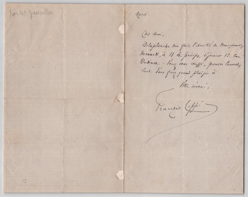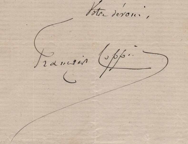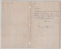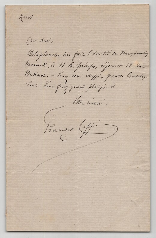 François Coppée. Lettre autographe signée, "Pauvre convalescent" Poète, dramaturge et romancier français Lettre autographe signée de François Coppée, non datée. Rédigée à l'encre noire sur un double feuillet de papier vergé. « Mardi Cher ami, Delaplanche me fait l'amitié de venir, demain mercredi, à 11h précises, déjeuner 12, rue Oudinot. Venez donc aussi, pauvre convalescent. Vous ferez grand plaisir Votre dévoué. » Dimensions : 13,1 x 20,5 cm État : Traces d'onglets au dos, sinon bel état de conservation. Voir photos pour plus de détails. Nombre de pages : 1 page François Coppée François Coppée, né le 26 janvier 1842 à Paris et mort le 23 mai 1908 dans la même ville, est un poète, dramaturge et romancier français. Coppée fut le poète populaire et sentimental de Paris et de ses faubourgs, des tableaux de rue intimistes du monde des humbles. Wikipédia