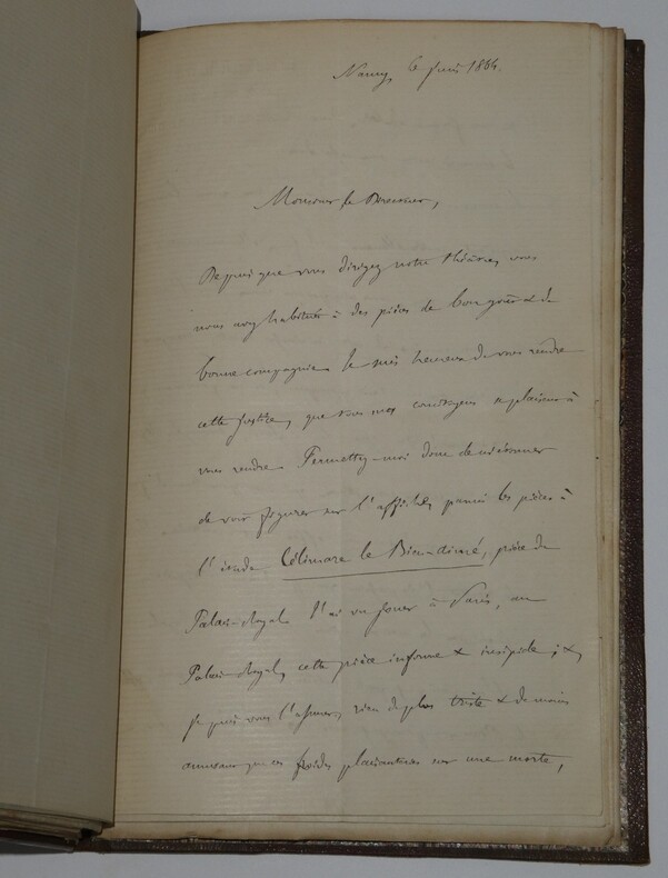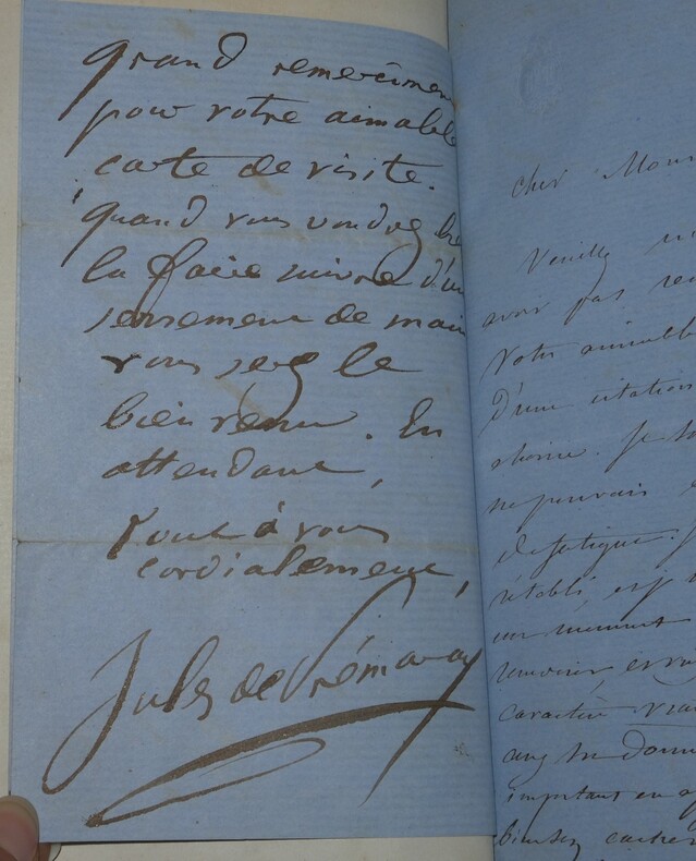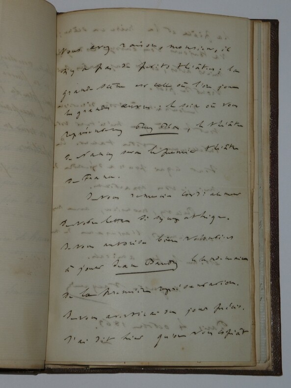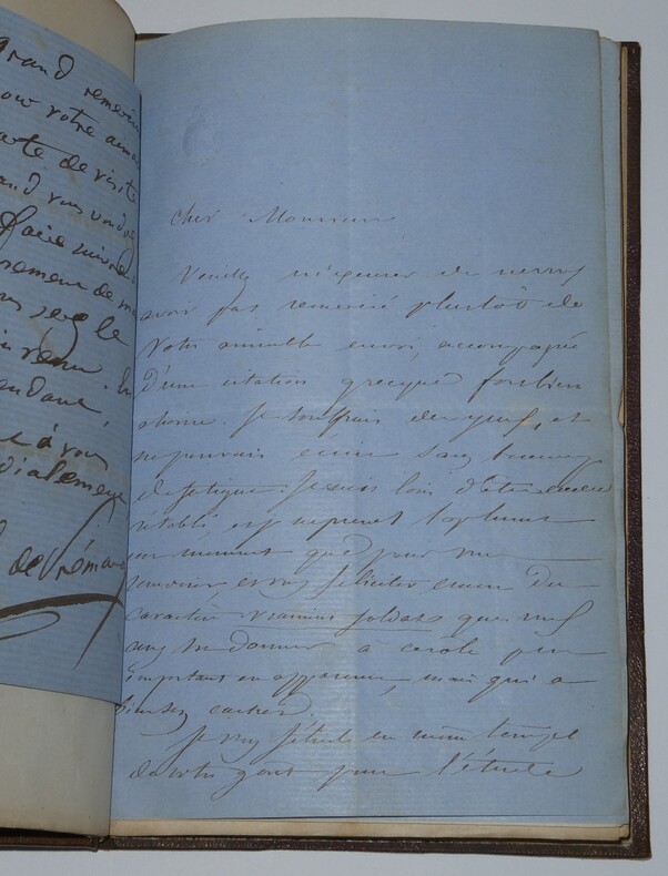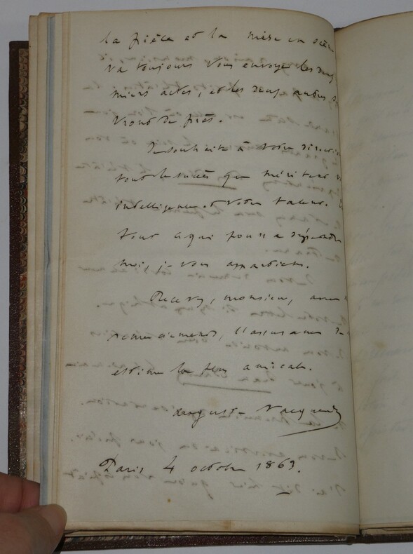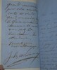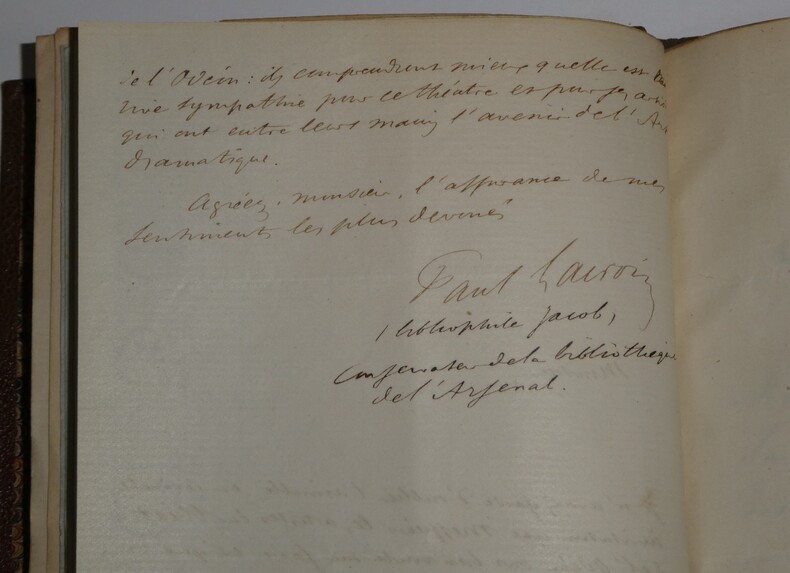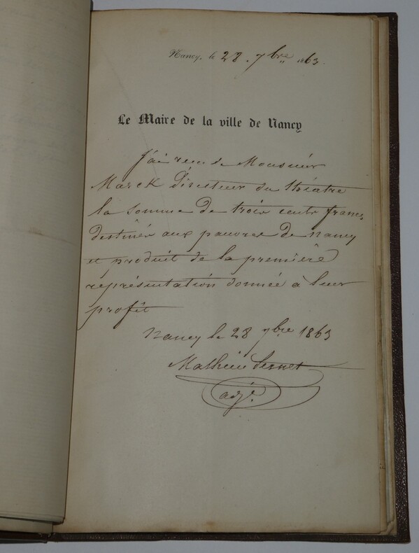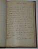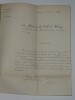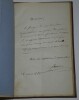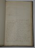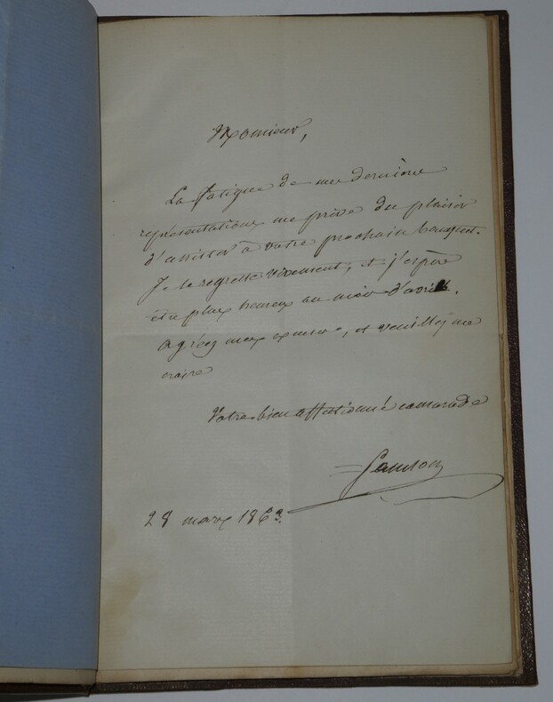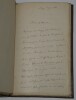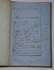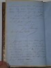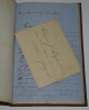Album Collection d'Émile Marck de 27 LAS, Paul Lacroix, Jules Lacroix et d'autres, 1862/1963/1964 Directeur du Théâtre National de l'Odéon Ce recueil, constitué avec soin, rassemble 27 lettres autographes signées adressées à Émile Marck, figure polyvalente du théâtre français (directeur du Théâtre de Nancy, puis codirecteur de l'Odéon avec Émile Desbeaux). Les lettres abordent des sujets cruciaux pour l'histoire littéraire : droits d'auteur, mises en scène, demandes de décors, représentations et relations mondaines. Parmi les auteurs des lettres, se trouvent : Paul Lacroix , plus connu sous les pseudonymes de P. L. Jacob ou du Bibliophile Jacob Jules Lacroix , poète, traducteur, librettiste, dramaturg e français et frère du Bibliophile Jacob Jules de Prémaray , auteur dramatique et critique théâtral français Joseph Samson , comédien et auteur dramatique français le Prince de Beauvau La Comtesse de Chambrun, Louis Lallement, etc. Une lettre non reliée est jointe à l'album, elle est adressée au petit fils d'Émile Marck, Jacques Majorelle , peintre orientaliste français. Cette lettre fait référence à l'envoi de photographies de sa mère, Marie Léonie Jane Kretz (la fille d'Émile Marck) : « [...] je t'adresse un souvenir de ta chère Maman, qui je l'espère te fera plaisir, si toutefois tu ne le possède déjà. Ces ravissantes photographies ont été données à Monsieur Montigny qui percevait les droits d'Auteurs au théâtre, par Monsieur Marck alors Directeur du Théâtre à Nancy, ton grand-père. [...] » Dimensions de l'album : 14,3 x 21,9 cm État : Bel état de conservation. Voir photos et description pour plus de détails.