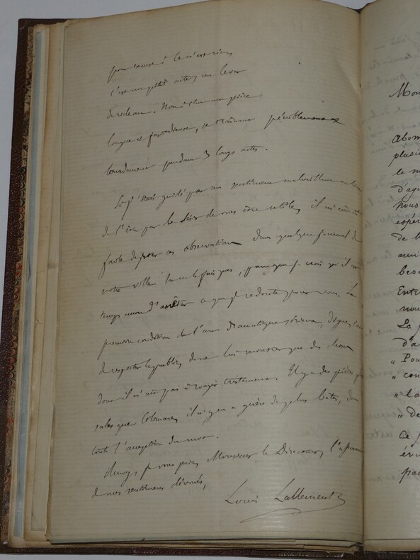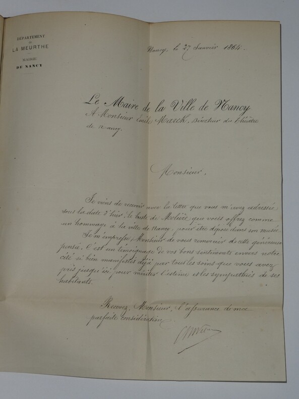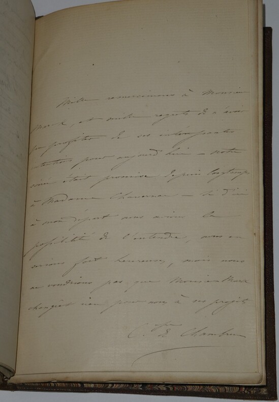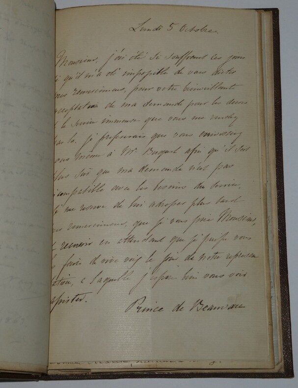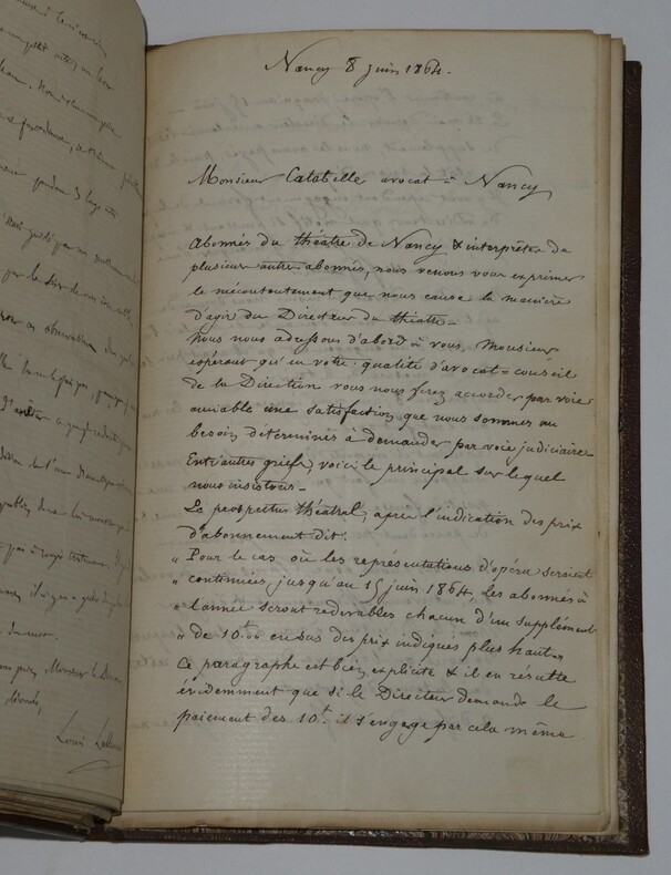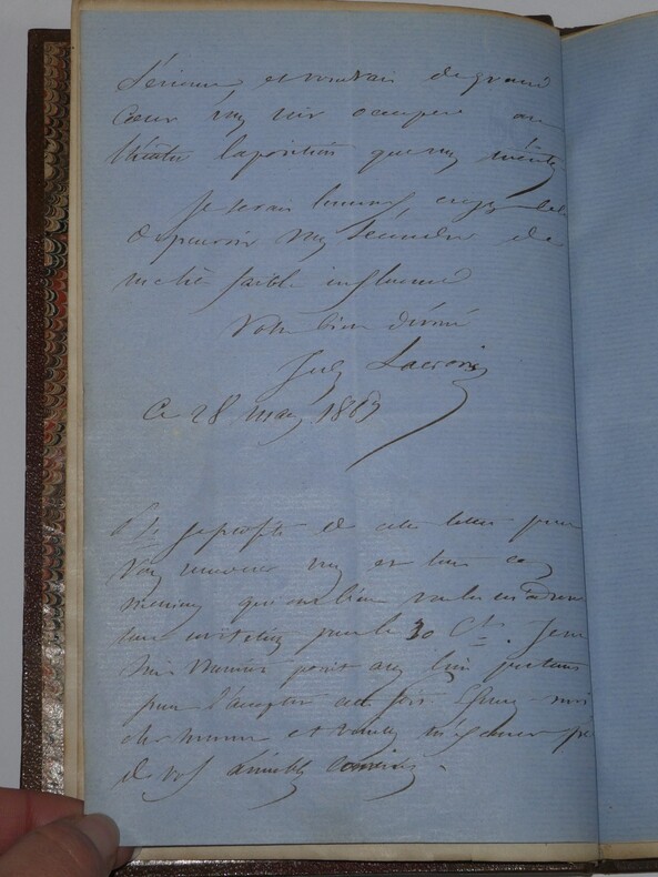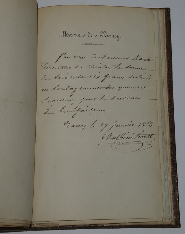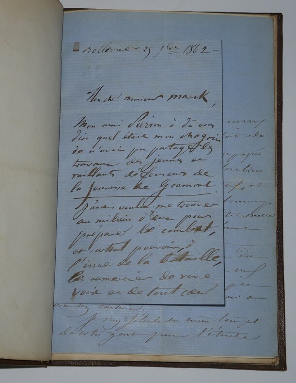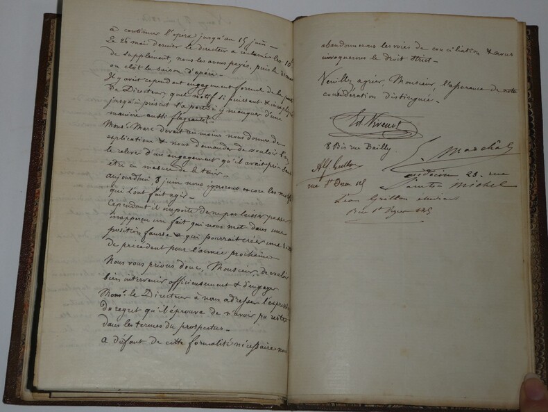 Album Collection d'Émile Marck de 27 LAS, Paul Lacroix, Jules Lacroix et d'autres, 1862/1963/1964 Directeur du Théâtre National de l'Odéon Ce recueil, constitué avec soin, rassemble 27 lettres autographes signées adressées à Émile Marck, figure polyvalente du théâtre français (directeur du Théâtre de Nancy, puis codirecteur de l'Odéon avec Émile Desbeaux). Les lettres abordent des sujets cruciaux pour l'histoire littéraire : droits d'auteur, mises en scène, demandes de décors, représentations et relations mondaines. Parmi les auteurs des lettres, se trouvent : Paul Lacroix , plus connu sous les pseudonymes de P. L. Jacob ou du Bibliophile Jacob Jules Lacroix , poète, traducteur, librettiste, dramaturg e français et frère du Bibliophile Jacob Jules de Prémaray , auteur dramatique et critique théâtral français Joseph Samson , comédien et auteur dramatique français le Prince de Beauvau La Comtesse de Chambrun, Louis Lallement, etc. Une lettre non reliée est jointe à l'album, elle est adressée au petit fils d'Émile Marck, Jacques Majorelle , peintre orientaliste français. Cette lettre fait référence à l'envoi de photographies de sa mère, Marie Léonie Jane Kretz (la fille d'Émile Marck) : « [...] je t'adresse un souvenir de ta chère Maman, qui je l'espère te fera plaisir, si toutefois tu ne le possède déjà. Ces ravissantes photographies ont été données à Monsieur Montigny qui percevait les droits d'Auteurs au théâtre, par Monsieur Marck alors Directeur du Théâtre à Nancy, ton grand-père. [...] » Dimensions de l'album : 14,3 x 21,9 cm État : Bel état de conservation. Voir photos et description pour plus de détails.