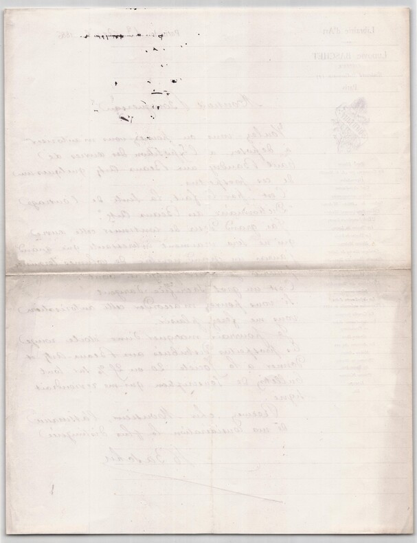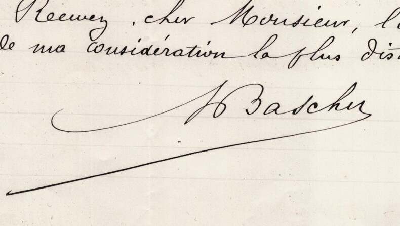 Ludovic Baschet. Lettre autographe signée, Dictionnaire des Beaux Arts, 1886 Artiste peintre, décorateur, galeriste et éditeur d'art français Lettre autographe signée de Ludovic Baschet , adressée à Monsieur Bouguereau, datée du 13 avril 1886 à Paris. Rédigée à l'encre noire sur un feuillet de papier vélin, avec entête imprimée "Librairie d'Art Ludovic Baschet éditeur ...". Dans ce courrier à caractère professionnel, Baschet sollicite l’autorisation de déposer des prospectus lors de l’exposition des œuvres de Paul Baudry, afin de poursuivre la publication de son Dictionnaire des Beaux-Arts grâce aux souscriptions. Il précise en contrepartie son engagement à reverser à la société de son correspondant 20 à 25 % des bulletins de souscription qui lui reviendraient signés. Le document illustre concrètement les mécanismes de financement éditorial par souscription dans le milieu artistique parisien de la fin du XIXᵉ siècle, ainsi que les liens entre éditeurs d’art et grands peintres institutionnels. Dimensions : 21,1 x 27,1 cm État : Voir photos et description pour plus de détails. Nombre de pages : 1 page Ludovic Baschet Ludovic Baschet, né le 19 septembre 1834 à Paris 3ᵉ et mort à Paris 6ᵉ le 13 juin 1909, est un artiste peintre, décorateur, galeriste et éditeur d'art français. Il est entre autres le père de René Baschet, patron de presse, et du portraitiste Marcel Baschet. Wikipédia