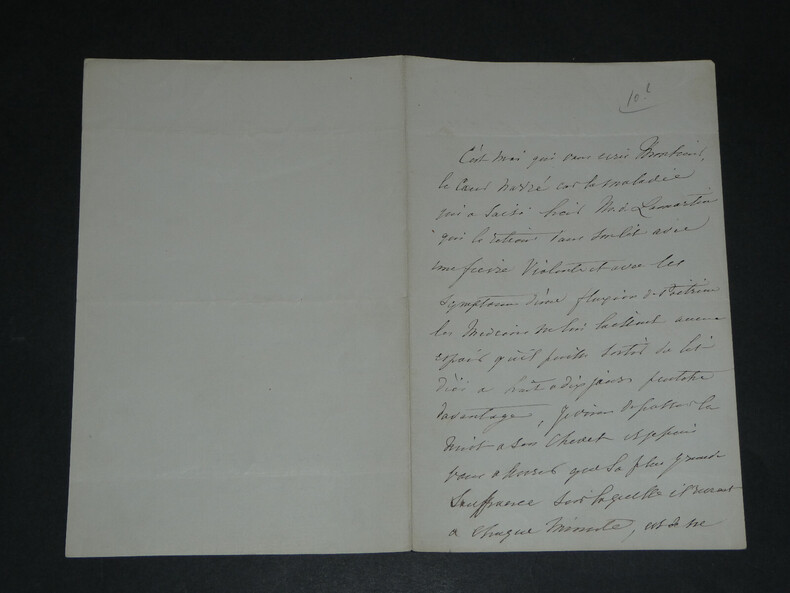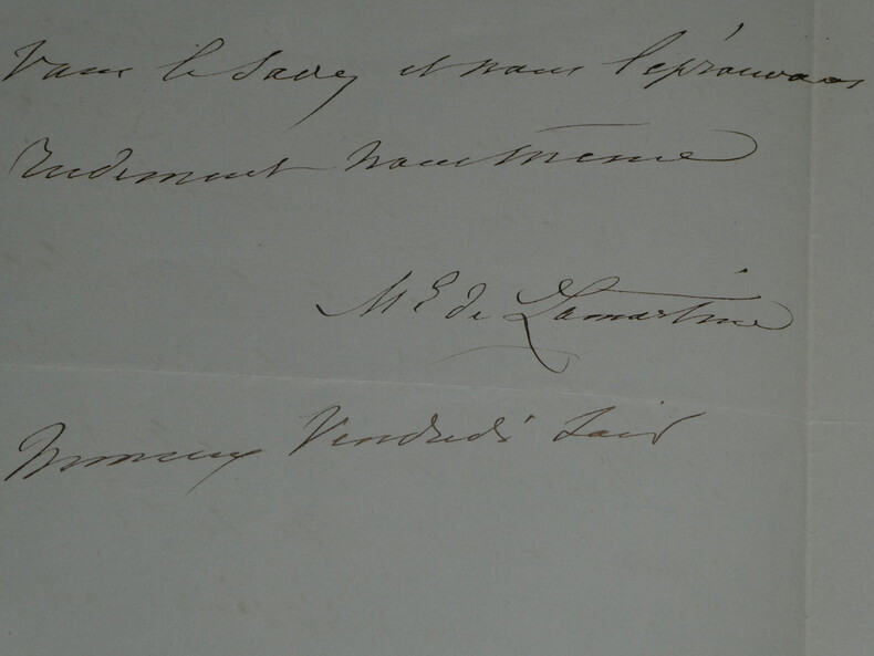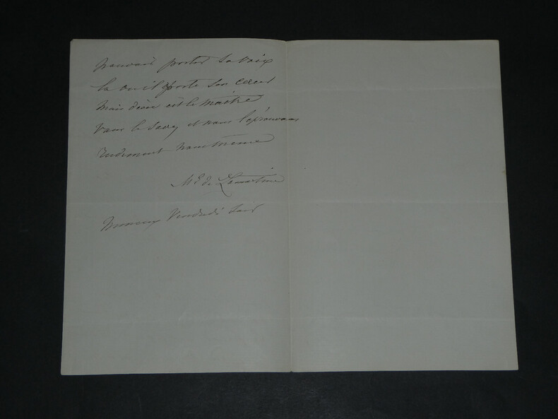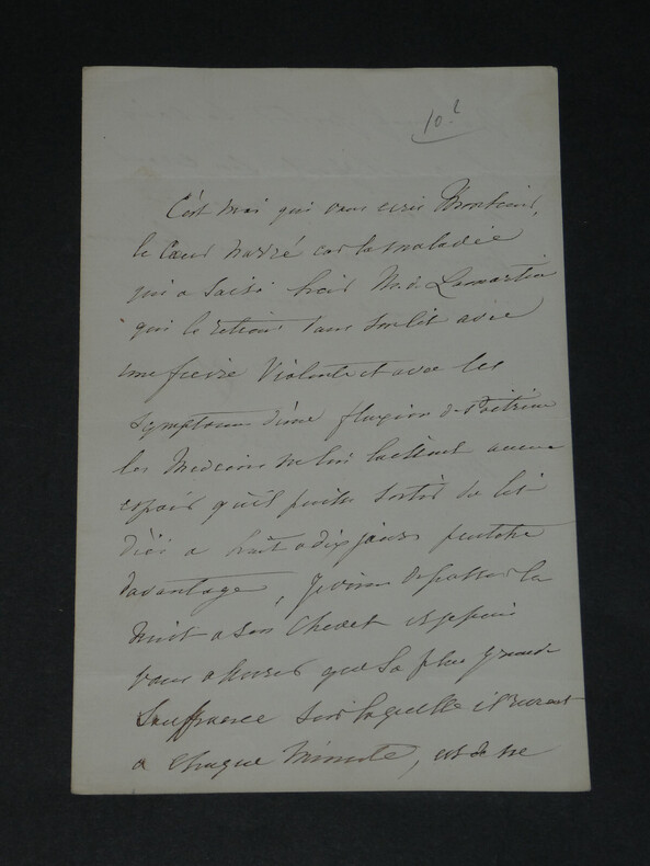Elisa de LAMARTINE. Lettre autographe signée Artiste peintre Lettre autographe signée, non datée. Son époux Alphonse de LAMARTINE souffre d'une violente fièvre et ne peut sortir de son lit. "Les médecins ne lui laissent aucun espoir qu'il puisse sortir du lit d'ici à huit à dix jours peut-être davantage." Dimensions : 13,4 x 20,6 cm État : Voir photos pour plus de détails. Nombre de pages : 2 pages
