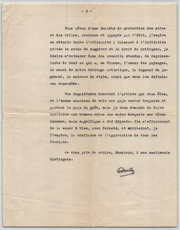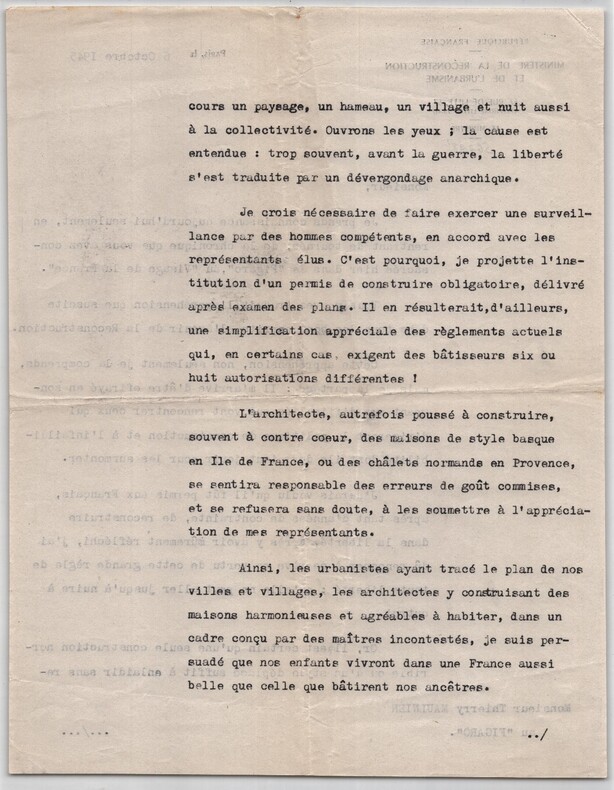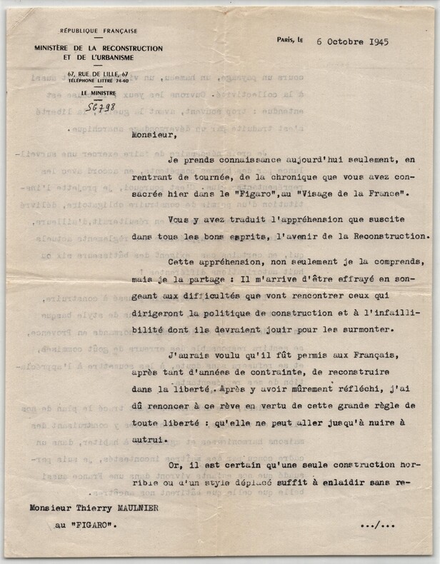 Raoul Dautry. Lettre dactylographiée signée à Thierry Maulnier, Reconstruction de la France et permis de construire, 1945 Très intéressante lettre dactylographiée signée de Raoul Dautry, adressée à Thierry Maulnier, datée du 6 Octobre 1945, à Paris. Rédigée sur deux feuillets de papier vélin. Papier à en-tête officiel du ministère. Dans cette longue lettre de trois pages, Dautry répond à une chronique de Maulnier parue la veille dans Le Figaro (« Le Visage de la France »). Il y développe une réflexion structurée sur les enjeux esthétiques et civiques de la Reconstruction, la tension entre liberté individuelle et intérêt collectif, la nécessité d’un permis de construire, le rôle des architectes et urbanistes, et la protection des paysages et du patrimoine. Le propos, ferme mais argumenté, éclaire la doctrine administrative et culturelle mise en place à l’immédiat après-guerre. Il justifie l'obligation du permis de construire non comme une entrave, mais comme un rempart contre le « dévergondage anarchique » des constructions d'avant-guerre. On y trouve une charge célèbre contre les erreurs de goût : il refuse les « maisons de style basque en Ile de France » ou les « chalets normands en Provence » . Dautry affirme que la liberté individuelle ne doit pas nuire à l'intérêt collectif ni enlaidir le paysage français, qu'il considère comme un patrimoine national. Cette lettre s’inscrit dans le contexte immédiat de la Libération et de la Reconstruction de la France, alors que le pays fait face à des destructions massives, à une pénurie aiguë de logements et à la nécessité de repenser durablement l’aménagement du territoire. Nommé ministre de la Reconstruction et de l’Urbanisme en novembre 1944, Raoul Dautry joue un rôle central dans la mise en place des premières grandes orientations de la politique urbanistique de l’après-guerre. Ancien ingénieur et administrateur des chemins de fer, il défend une approche rationnelle, planifiée et culturellement exigeante de la reconstruction, où l’architecture et l’urbanisme deviennent des instruments d’intérêt général. Le destinataire, Thierry Maulnier, intellectuel influent et chroniqueur au Le Figaro, incarne alors une voix critique attentive aux enjeux esthétiques, moraux et civilisationnels de la France renaissante. Cet échange illustre un moment clé du débat public de 1945, où se confrontent liberté créatrice, responsabilité collective et protection du paysage français, conçu comme un héritage commun à transmettre. Dimensions : 21 x 27,1 cm État : Voir photos et description pour plus de détails. Nombre de pages : 3 pages