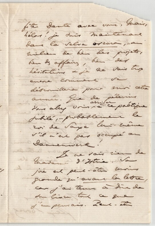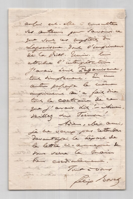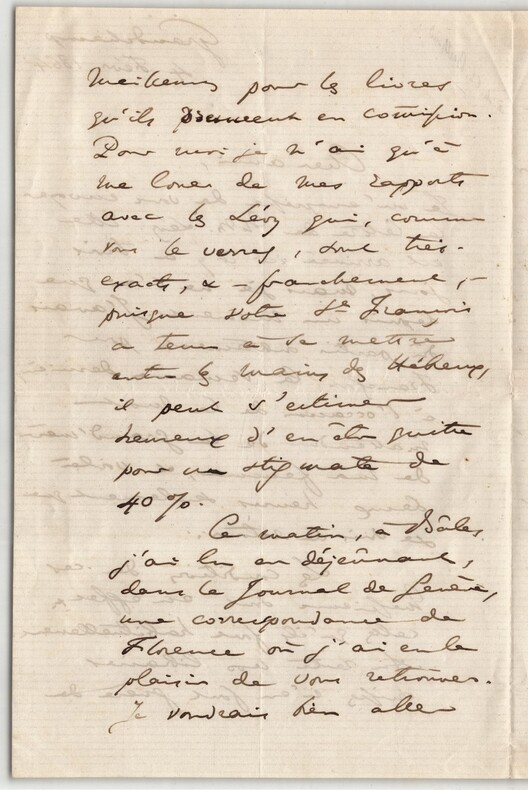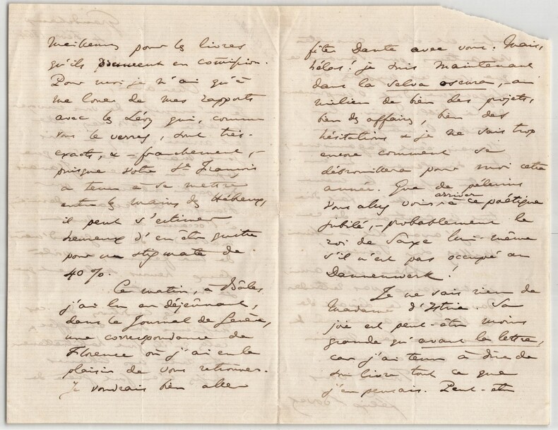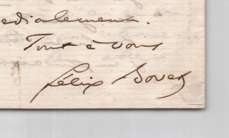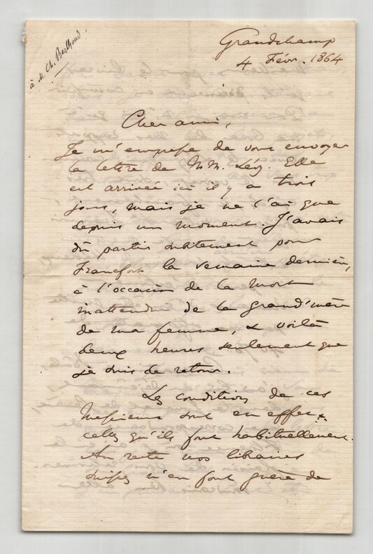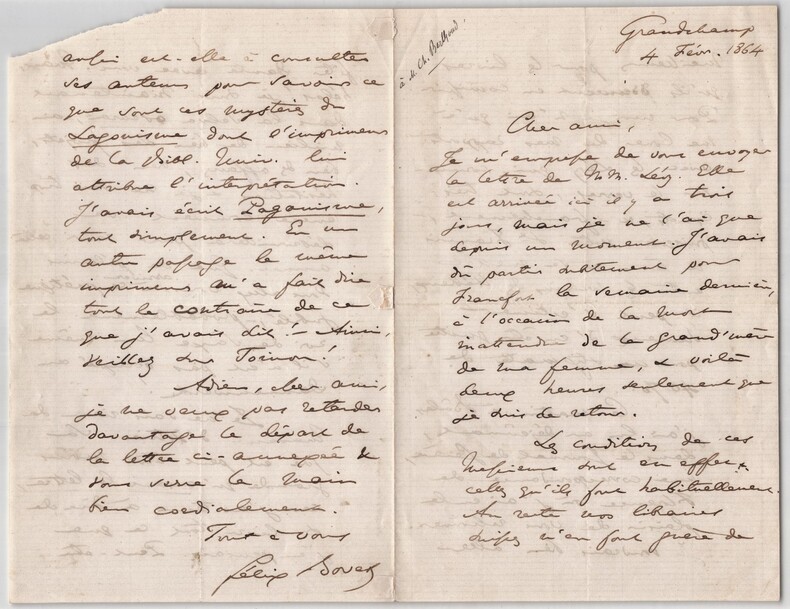 Félix Bovet. Lettre autographe signée à Ch. Berthoud, 1864 Théologien, professeur de littérature et directeur de bibliothèque suisse Lettre autographe signée de Félix Bovet, adressée à Monsieur Ch. Berthoud, datée du 4 février 1864 à Grand-Champ. Rédigée à l'encre brune sur un double feuillet de papier vergé. « Cher ami, Je m'empresse de vous envoyer la lettre de Mm. Lévy. Elle est arrivée ici il y a trois jours, mais je ne l'ai que depuis un moment. J'avais dû partir subitement pour Francfort la semaine dernière, à l'occasion de la mort inattendue de la grand-mère de ma femme, & voilà deux heures seulement que je suis de retour. Les conditions de ces messieurs sont en effet celles qu'ils font habituellement. Au reste vos libraires juifs n'en font guère de meilleures pour les livres qu'ils prennent en commission. [...] Ce matin, à Bâles, j'ai lu en déjeunant, dans le Journal de Genève, une correspondance de Florence où j'ai eu le plaisir de vous retrouver. Je voudrais bien aller fêter Dante avec vous : Mais hélas ! je suis maintenant dans la Selva oscura, au milieu de bien des projets, bien des affaires, bien des hésitations & je ne sais trop ancore comme se débrouillera pour moi cette année. Que de pélerins. Vous allez voir arriver à ce poétique jubilé, probablement le roi de la Saxe lui-même s'il n'est pas occupé au Dannewerk ! [...] J'avais écrit Paganisme, tout simplement. En un autre passage, le même imprimeur m'a fait dire tout le contraire de ce que j'avais dit ! [...] Adieu, cher ami, je ne veux pas retarder davantage le départ de la lettre ci-annexée & vous serre la main bien cordialement. Tout à vous » La lettre, d un ton amical et cultivé, témoigne de ses réseaux éditoriaux, de ses voyages et de ses réflexions littéraires au cours des années 1860. Dimensions : 13,6 x 21 cm État : T races d'onglet au dos, sinon bel état de conservation. Voir photos et description pour plus de détails. Nombre de pages : 4 pages Félix Bovet Félix Bovet, né le 7 novembre 1824 à Neuchâtel et mort le 4 septembre 1903 à Grandchamp, est un théologien, professeur de littérature et directeur de bibliothèque suisse. Wikipédia Lettres autographes, vieux papiers, livres anciens, photographies, gravures, timbres... Nous expertisons et/ou rachetons dans toute la France vos lettres, collections de lettres et livres anciens.