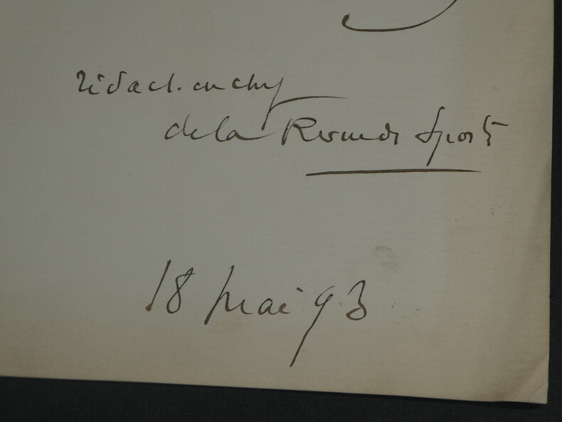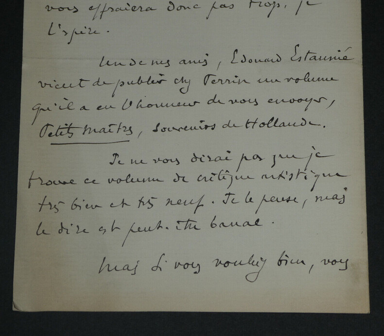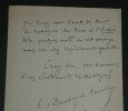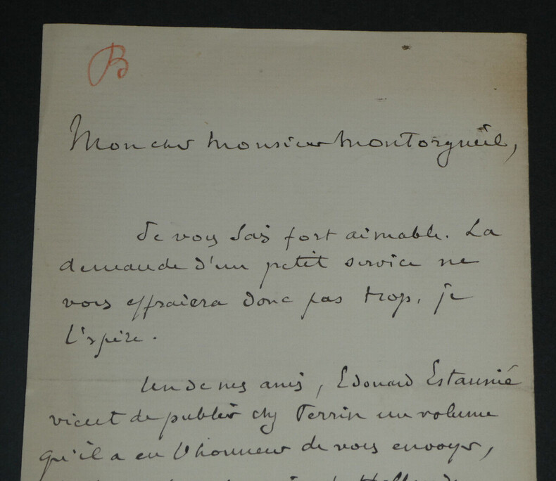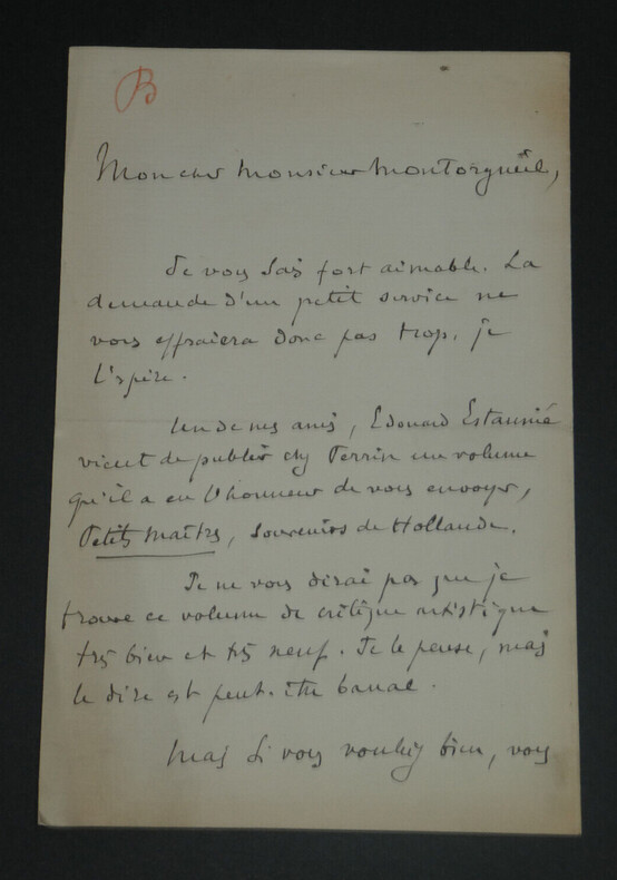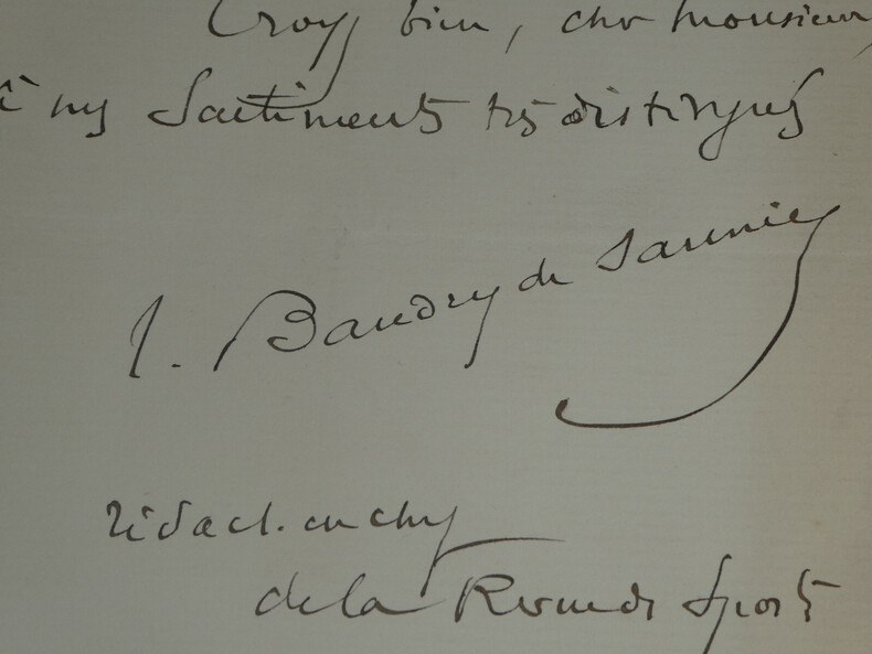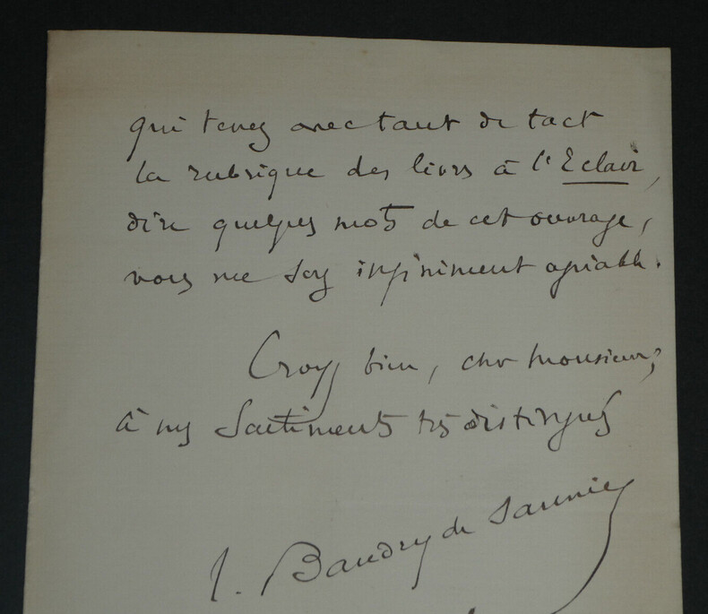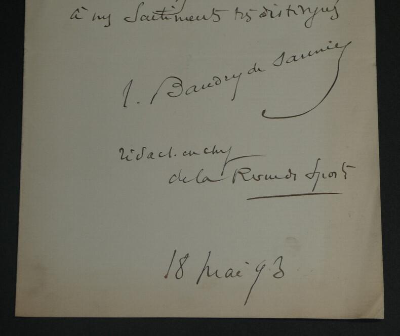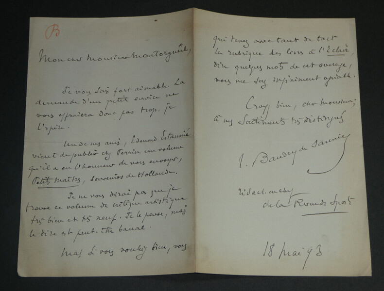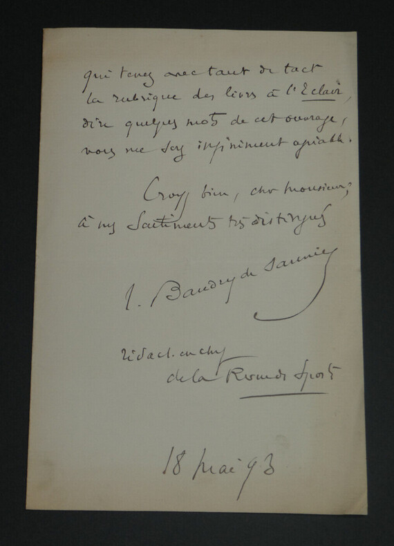 Louis Baudry de Saunier. Lettre autographe signée, 1893 Journaliste et écrivain français Lettre autographe signée de Louis Baudry de Saunier, adressée à Georges Montorgueil, datée du 18 mai 1893, écrite à l'encre noire sur un double feuillet. "Mon cher Monsieur Montorgueil, Je vous sais fort aimable. La demande d'un petit service ne vous effraiera donc pas trop, je l'espère. Un de mes amis, Édouard Estaunié vient de publier chez Perrin un volume qu'il a eu l'honneur de vous envoyer, "Petits Maîtres", souvenirs de Hollande. Je ne vous dirai pas que je trouve ce volume de critique artistique très bien et très neuf. Je le pense, mais le dire est peut-être banal. Mais si vous vouliez bien, vous qui tenez avec tant de tact la rubrique des livres à L Éclair, dire quelques mots de cet ouvrage, vous me serez infiniment agréable. Croyez bien, cher Monsieur, à mes sentiments très distingués." Dimensions : 13,6 x 21 cm État : Voir photos pour plus de détails. Nombre de pages : 2 pages
