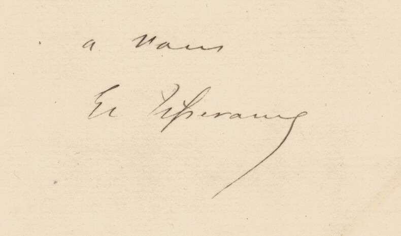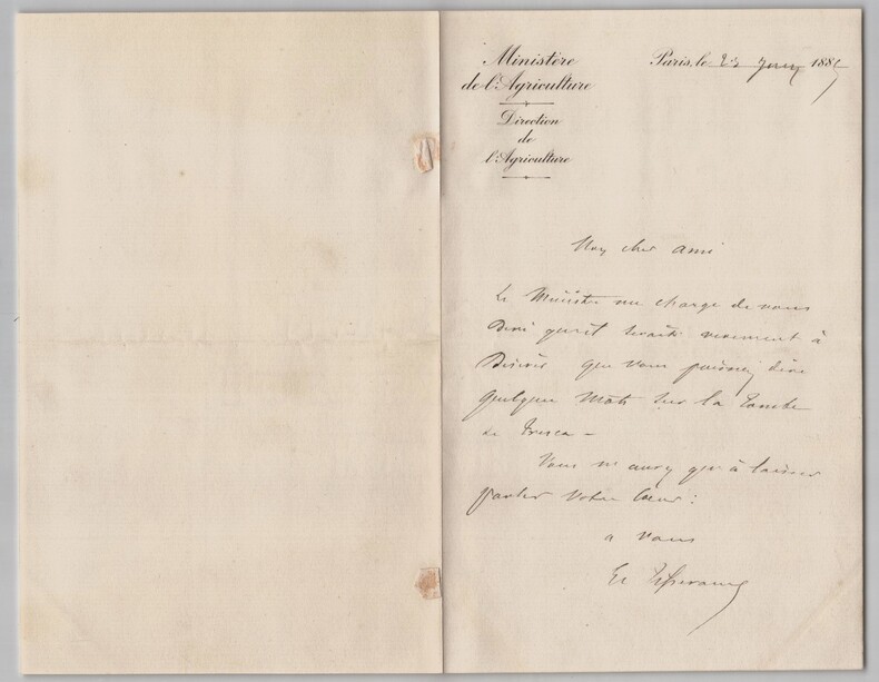 Eugène TISSERAND. Lettre autographe signée, Obsèques Henri TRESCA, 1885 Inspecteur général de l'agriculture Lettre autographe signée d'Eugène Tisserand, datée du 23 juin 1885, à Paris. Rédigée à l'encre brune sur un double feuillet de papier vergé filigrané avec entête imprimée du "Ministère de l'Agriculture - Direction de l'Agriculture". Eugène Tisserand, alors Directeur de l’Agriculture, y sollicite un ami proche, très certainement le Colonel Aimé Laussedat, directeur du Conservatoire National des Arts et Métiers, pour prononcer l'éloge funèbre du grand savant Henri Tresca. Henri Tresca est l'un des plus illustres ingénieurs français, membre de l'Académie des Sciences, dont le nom est inscrit sur la Tour Eiffel. Cette lettre est rédigée deux jours seulement après son décès et la veille de ses obsèques. « Paris, le 23 juin 1885 Mon cher ami, Le Ministre me charge de vous dire qu'il serait vraiment à désirer que vous puissiez dire quelques mots sur la tombe de Tresca _ Vous n'aurez qu'à laisser parler votre cœur. a vous » Le Colonel Aimé Laussedat prononcera effectivement l'éloge funèbre le lendemain, 24 juin 1885. Dimensions : 13 x 20,4 cm État : Voir photos et description pour plus de détails. Nombre de pages : 1 page