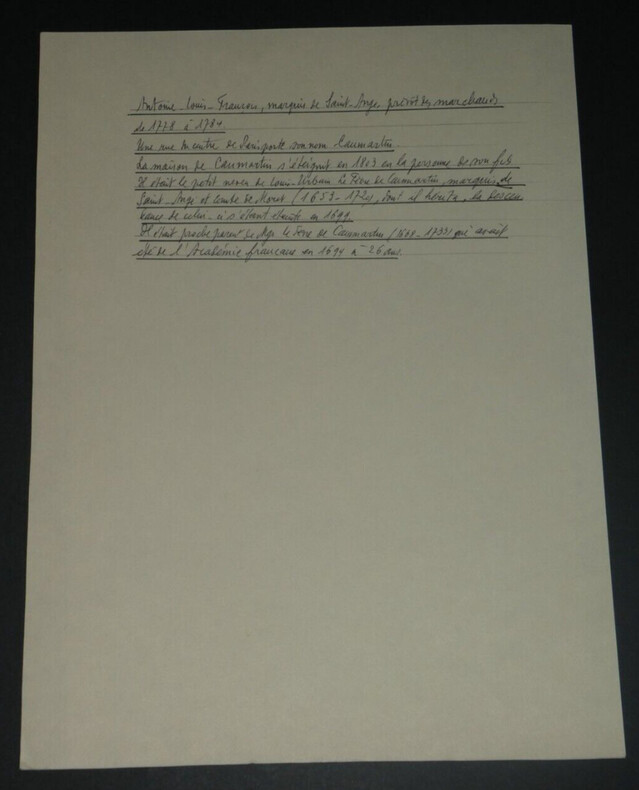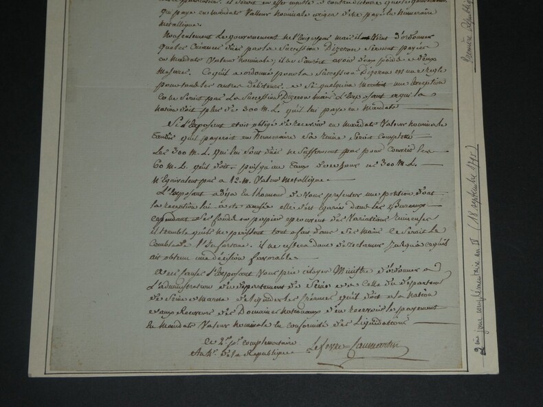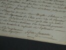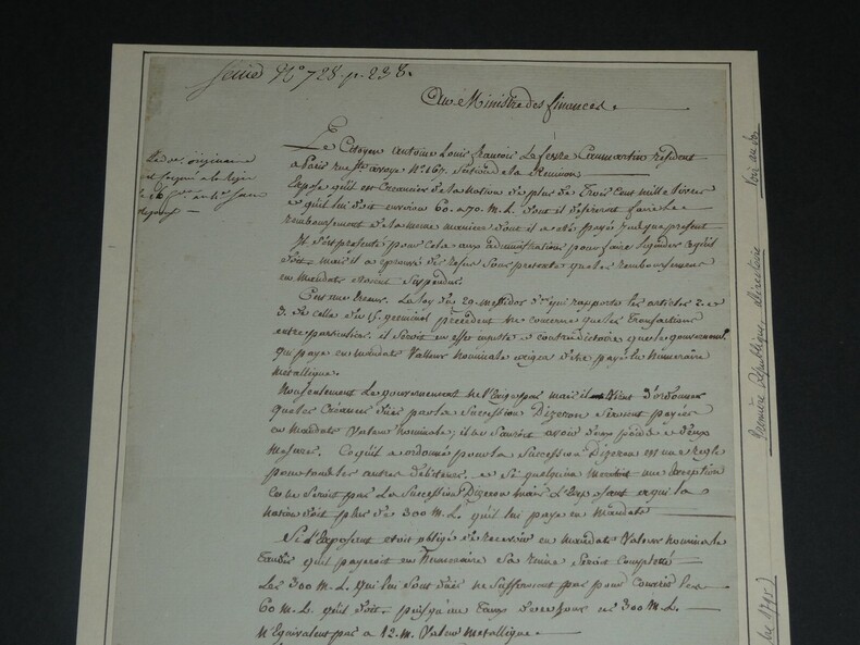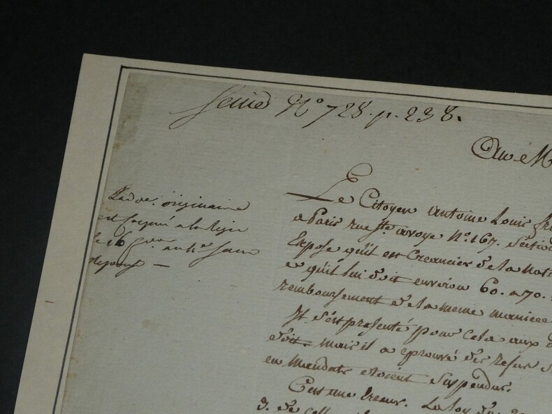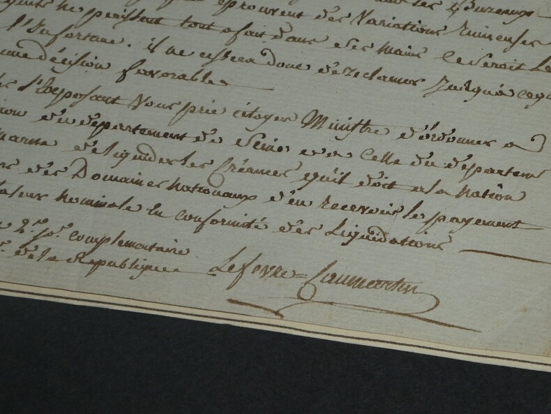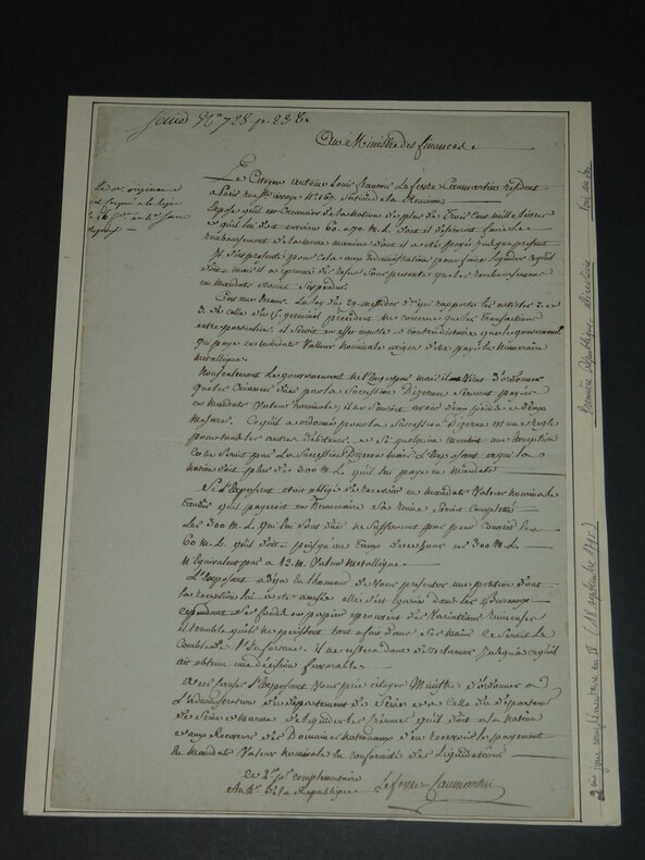 Lefebvre de Caumartin - Lettre autographe signée au Ministre des Finances 1796 Intendant de Flandre (1756-1778) Lettre autographe signée d'Antoine-Louis Lefebvre de Caumartin, adressée au Ministre des finances, datée du 2ème jour complémentaire An IV (18 septembre 1796), pour le remboursement d'une créance qu'il souhaite faire en mandat et non en numéraire métallique. Dimensions : Avec feuille cartonnée : 22,5 x 30,5 cm ; Lettre seule : 19,8 x 29,7 cm État : Lettre scotchée sur une feuille cartonnée avec biographie écrite au dos par un ancien collectionneur. Voir photos pour plus de détails. Nombre de pages : 1 page