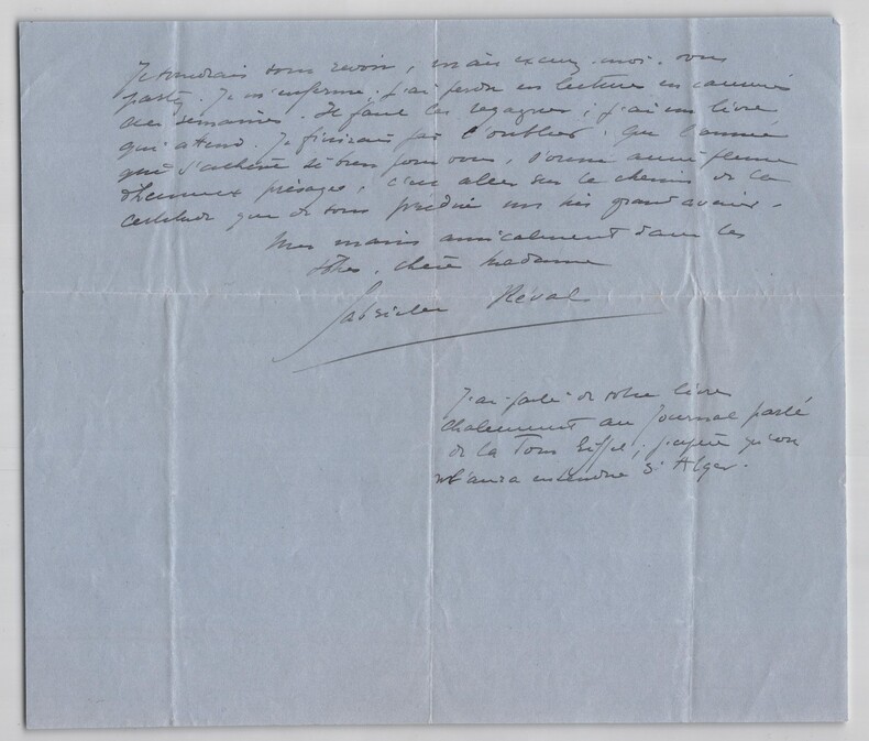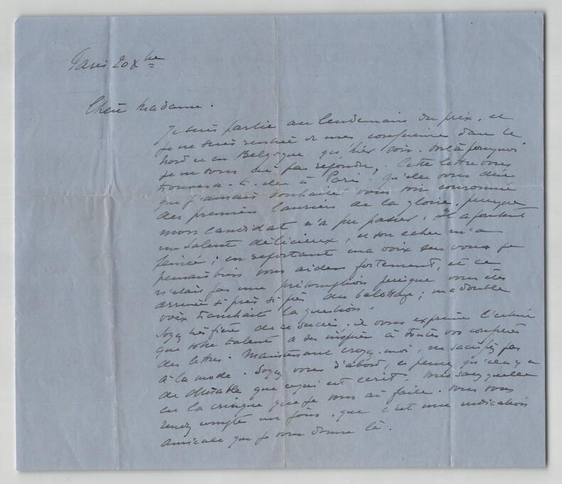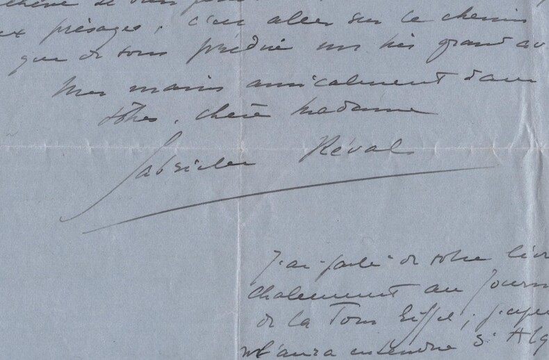 Gabrielle Réval. Lettre autographe signée Romancière et essayiste française Lettre autographe signée de Gabrielle Réval, datée du 20 décembre sans année, à Paris. Rédigée à l'encre noire sur un feuillet de papier vélin. « Chère Madame Je suis partie au lendemain du prix, et je ne suis rentrée de mes conférence dans le nord de la Belgique qu'hier soir. Voilà pourquoi je ne vous ai pas répondu. Cette lettre vous trouvera t-elle à Paris ? Qu'elle vous dise que j'aurais souhaité vous voir couronnée des premiers lauriers de la Gloire, puisque mon candidat n'a pas pu passer, il a pourtant un talent délicieux, et son échec m'a peinée ; en reportant ma croix sur vous je pensais bien vous aider fortement, et ce n'était pas une présomption puisque vous êtes arrivée si près si prèsau balottage ; ma double voix tranchait la question. Soyez très fière de ce succès. [...] » Dimensions : 21 x 18 cm État : Bel état de conservation. Voir photos et description pour plus de détails. Nombre de pages : 2 pages Gabrielle Réval Gabrielle Réval est le nom de plume de Gabrielle Élise Victoire Logerot, née à Viterbe le 20 décembre 1869 et morte à Lyon le 15 octobre 1938, romancière et essayiste française. Wikipédia