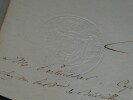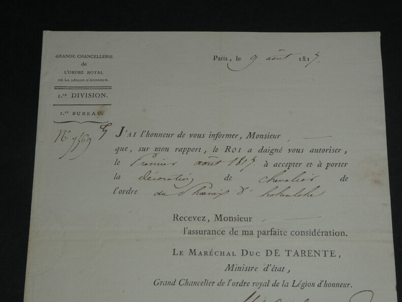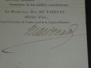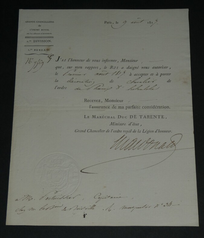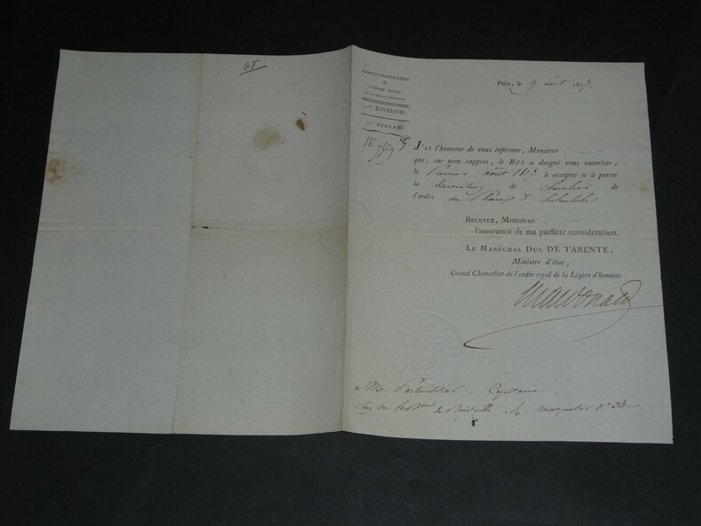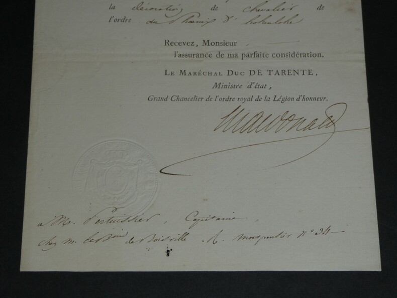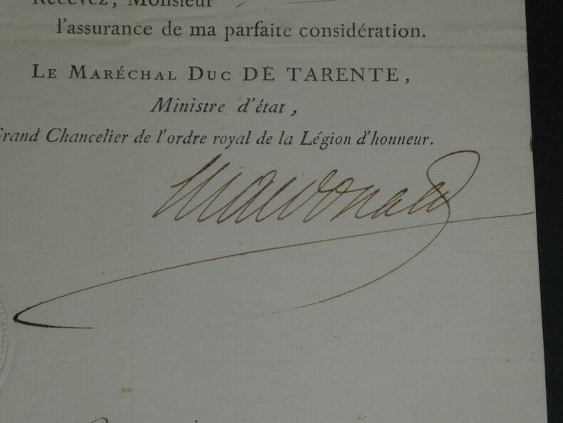 Maréchal Étienne Macdonald, 1er Duc de Tarente. LETTRE SIGNÉE Légion d'honneur, 1817 Dimensions : 23.5 x 18 cm État : Voir photos pour plus de détails. Nombre de pages : 1 page Étienne MACDONALD Étienne Macdonald, 1 duc de Tarente, né le 17 novembre 1765 à Sedan et mort le 25 septembre 1840 à Beaulieu-sur-Loire, est un général français de la Révolution et un maréchal d'Empire. Wikipédia Lettres autographes, vieux papiers, livres anciens, photographies, gravures, timbres... Nous expertisons et/ou rachetons dans toute la France vos lettres, collections de lettres et livres anciens.
