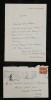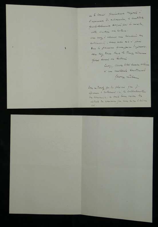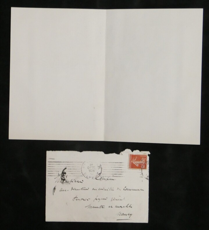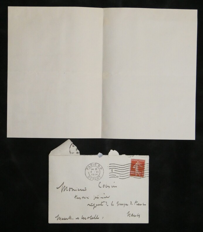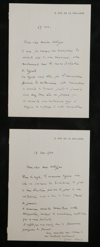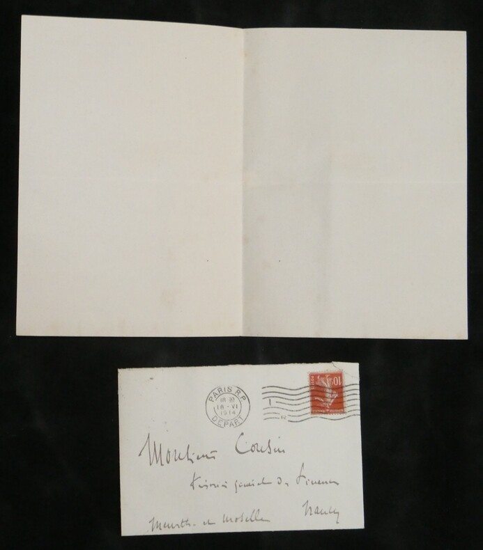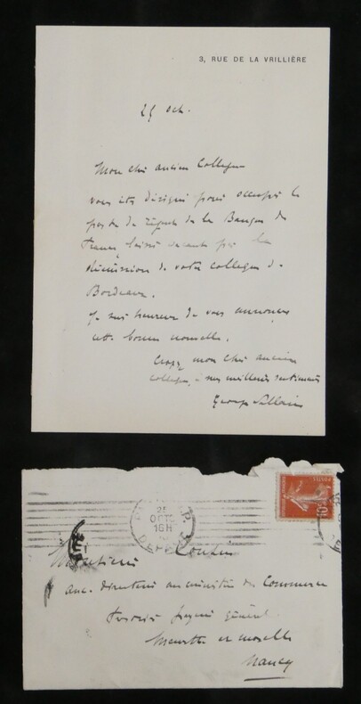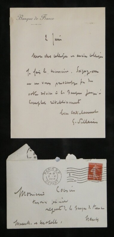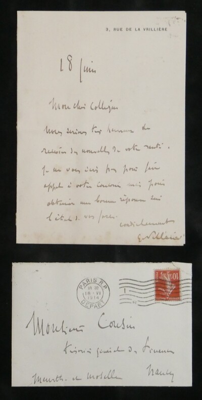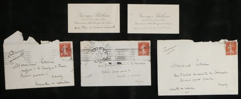 Georges Pallain. Ensemble de 5 Lettres autographes signées, 2 cartes de visite autographes et 3 enveloppes, 1914 Haut fonctionnaire français Ensemble de 5 lettres autographes signées, 2 cartes de visite autographes et 3 enveloppes de Georges Pallain. État : Traces d'onglet aux dos de chaque document. Voir photos et description pour plus de détails. Nombre de pages : 8 pages Ces documents sont issus de la collection des familles Risler et Cousin, figures emblématiques de la grande industrie alsacienne. Outre leur influence économique, ces lignées se sont distinguées par une érudition profonde et une passion pour la conservation du patrimoine écrit. Ce fonds témoigne de l'exigence d'une famille de collectionneurs avertis, ayant su réunir et préserver des correspondances d'une grande valeur historique et littéraire.