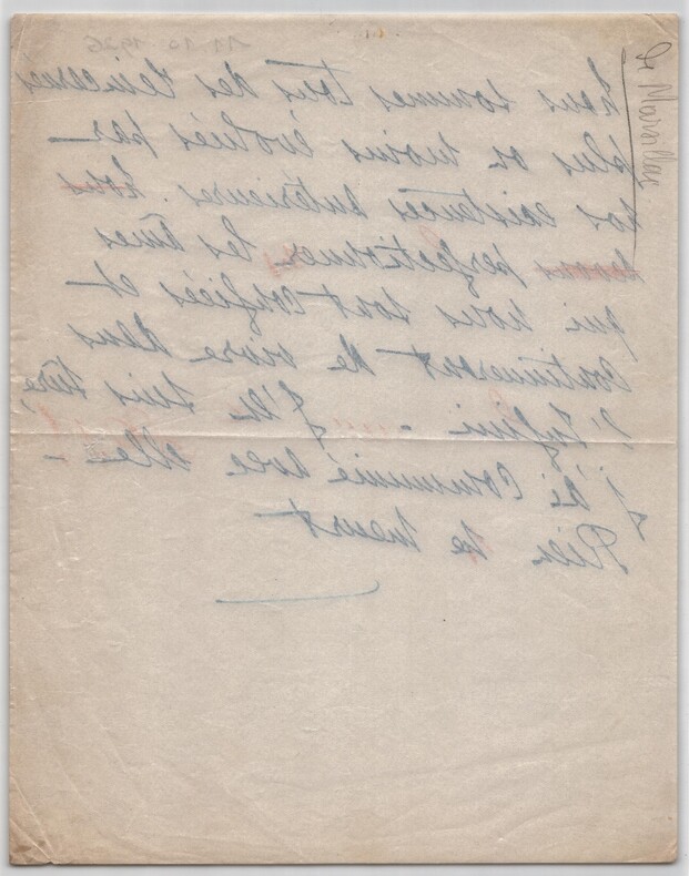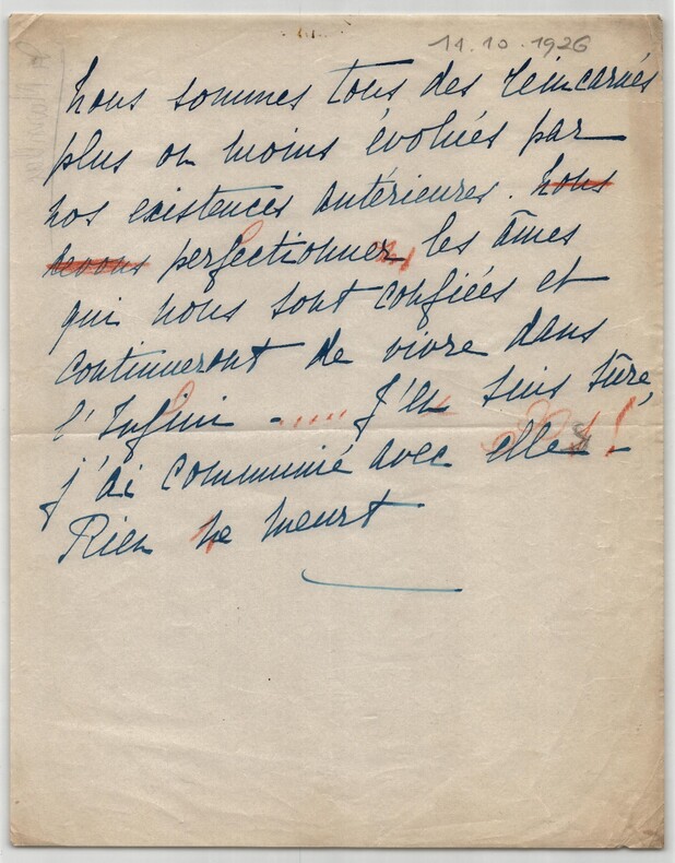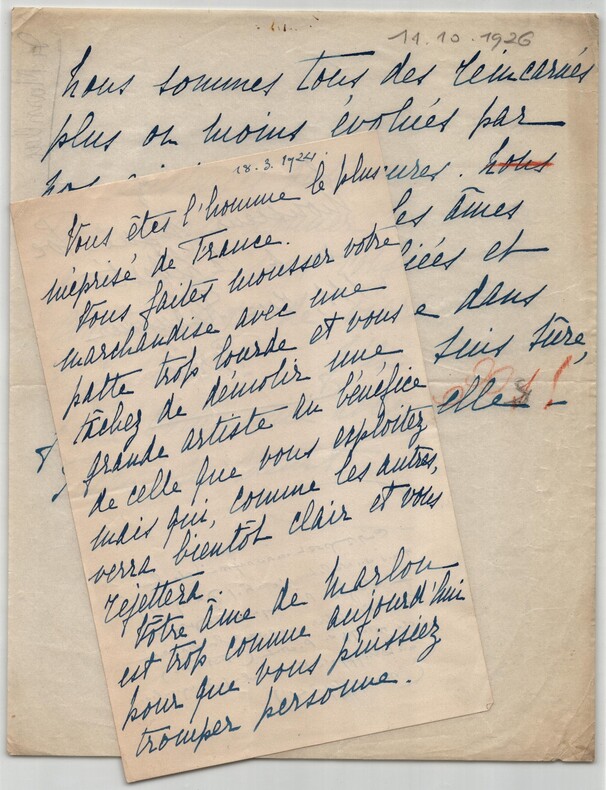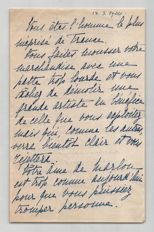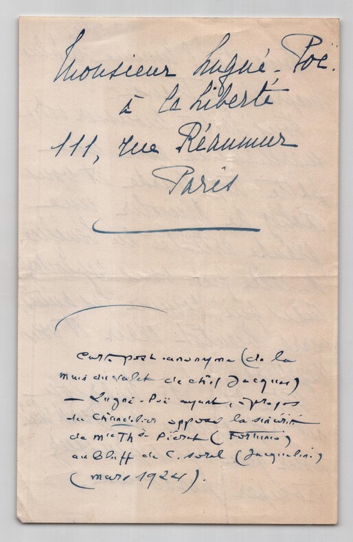 Lettre anonyme contre Lugné-Poe + note manuscrite mystique - 1924/26 Lot d'une lettre anonyme et une note manuscrite mystique de la même main. 1/ Lettre autographe anonyme virulente contre Aurélien Lugné-Poe, datée du 18 mars 1924. Rédigée à l'encre bleue sur un feuillet de papier vélin. Une attaque frontale contre le célèbre directeur du Théâtre de l' uvre. Une note d'époque identifie l'auteur comme étant le « valet de chambre Jacques ». Elle précise l'origine du courroux : une critique de Lugné-Poe dans le journal La Liberté où il opposait la sincérité de Thérèse Piérat (Comédie-Française) au « bluff » de la célèbre Cécile Sorel. Un document intéressant sur les rivalités d'actrices et la violence des critiques de l'époque. « Vous êtes l'homme le plus méprisé de France. Vous faites mousser votre marchandise avec une patte trop lourde et vous tâchez de démolir une grande artiste au bénéfice de celle que vous exploitez mais qui, comme les autres, verra bientôt clair et vous rejettera. Vôtre âme de Marlou est trop connue aujourd'hui pour que vous puissiez tromper personne. Monsieur Lugné-Poe à la liberté 111, rue Réaumur Paris » Note additionnelle en bas de page d'une autre main : « [Correspondance] anonyme (de la main du valet de chambre Jacques) - Lugné-Poe ayant, à propos du Chancelier opposé la sincérité de Mlle Th. Piérat (Fortunio) au Bluff de C. Sorel (Jacqueline) (mars 1924). » Dimensions : 13,4 x 21,2 cm État : Voir photos et description pour plus de détails. Nombre de pages : 2 pages 2/ Note Manuscrite Mystique, datée du 11 octobre 1926 au crayon. Rédigée à l'encre bleue sur un feuillet de papier vélin fin. Une réflexion profonde sur la réincarnation. Ce document révèle une facette spirituelle étonnante de la même personne capable, deux ans plus tôt, d'une grande violence épistolaire. « Nous sommes tous des réincarnés plus ou moins évolués par nos existences antérieures. Perfectionnons les âmes qui nous sont confiées et continueront de vivre dans l Infini..... J en suis sûre, j ai communié avec elles ! Rien ne meurt » Dimensions : 21 x 26,7 cm État : Voir photos et description pour plus de détails. Nombre de pages : 1 page
