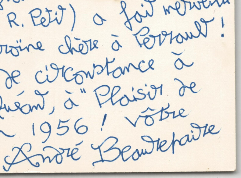 André Beaurepaire. Carte postale autographe signée, 1956 Peintre Carte postale autographe signée d'André Beaurepaire, adressée à Olivier Quéant , romancier et directeur de la revue "Plaisir de France" . "Cher Monsieur Quéant, nôtre "Cendrillon", dont la première eût lieu le 15 décembre à "La Scala", un Triomphe ! La jeune déjà grande Violette Verdy (la vedette du "Loup" de R. Petit) a fait merveille dans le rôle de l'héroïne chère à Perrault ! V ux cordiaux de circonstance à vous, à Madame Quéant, à "Plaisir de France" pour l'an 1956 ! Vôtre" Dimensions : 14,9 x 10,5 cm État : Voir photos et description pour plus de détails. Nombre de pages : 1 page