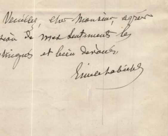 Émile Labiche - Lettre autographe signée sur son jeune compatriote Henri Leroy Sénateur Lettre autographe signée d'Émile Labiche écrite sur un papier à en-tête "Sénat", à Paris le 4 Juin 1901. Il demande à son destinataire d'être d'une bienveillance envers son protégé : " "Cher Monsieur, Je porte un très grand intérêt à mon jeune compatriote Henri Leroy (de Belfort) qui a été admissible l'an dernier au commun d'institut agronomique. je vous demande la permission d'appeler sur mon jeune protégé toute votre bienveillance. Veuillez, cher Monsieur, agréer l'expression de mes sentiments les plus distingués et bien dévoués. Emile Labiche" Dimensions : 20,5 x 13 cm État : Voir photos et description pour plus de détails. Nombre de pages : 1 page Emile Labiche Émile Charles Didier Labiche est né le 25 novembre 1827 à Béville-le-Comte et mort à Paris le 8 avril 1922 . Docteur en droit en 1852, il est avocat à la Cour d'appel, préfet d'Eure-et-Loir, sénateur et président du conseil général du même département. Portrait photographique d' Émile Labiche .
