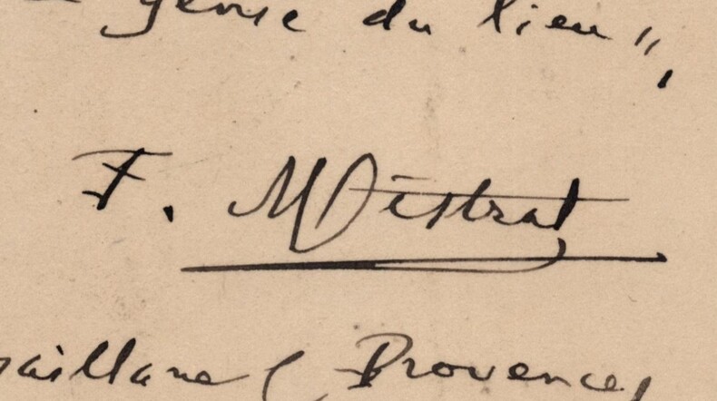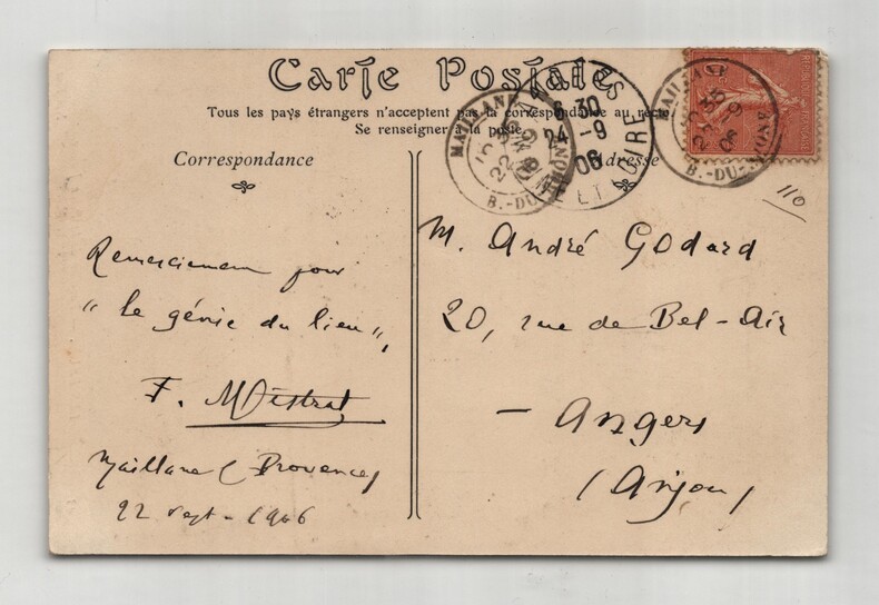 Frédéric Mistral. Carte postale autographe signée à André Godard, Maillane, 1906 Écrivain et lexicographe français Carte postale autographe signée de Frédéric Mistral, datée du 22 septembre 1906 à Maillane (B.-du-Rhône), adressée à Monsieur André Godard. Rédigée à l'encre noire sur une carte postale du Pavillon de la Reine Jeanne. « Remerciements pour "le génie du lieu" Maillane (Provence) 22 sept. 1906 » Dimensions : 13,8 x 9 cm État : Bel état de conservation. Voir photos et description pour plus de détails. Nombre de pages : 1 page