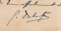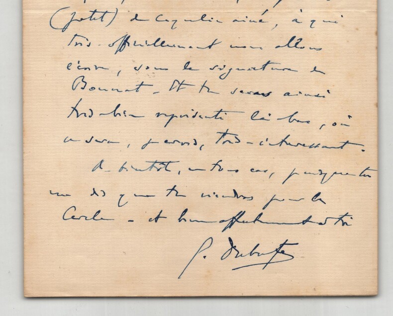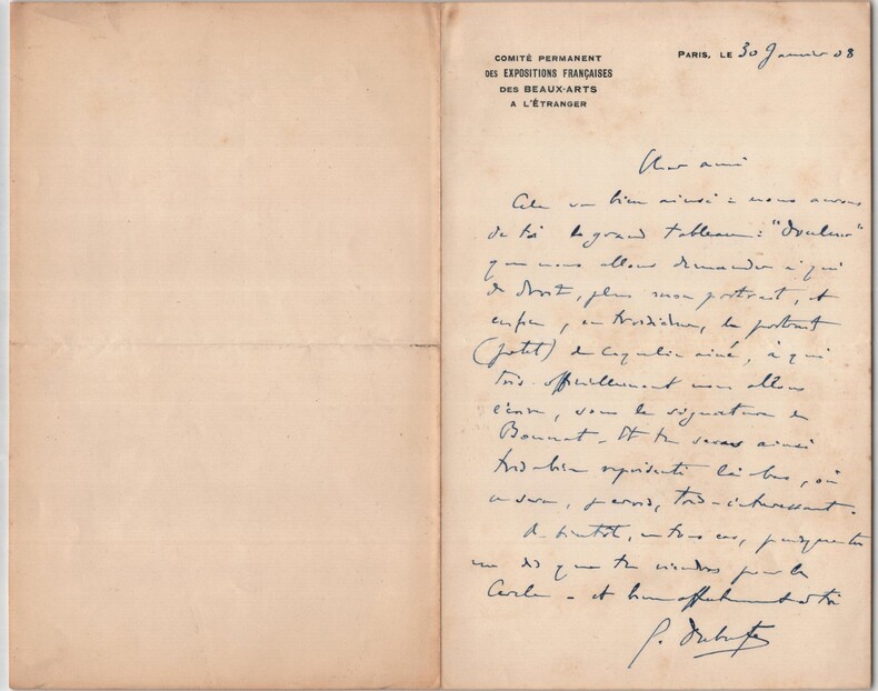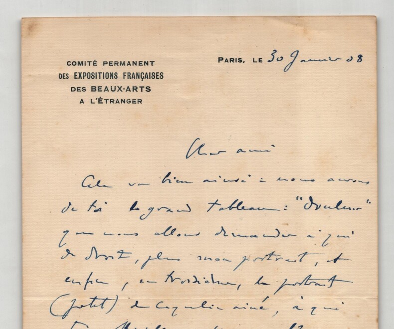 Guillaume Dubufe. Lettre autographe signée, 1908 Peintre et illustrateur français Lettre autographe signée de Guillaume Dubufe, datée du 30 janvier 1908 à Paris. Rédigée à l'encre bleue sur un double feuillet de papier vélin à entête du "Comité permanent des Expositions Françaises des Beaux-Arts à l'étranger. Dans cette lettre adressée à un proche, Guillaume Dubufe organise l’envoi de plusieurs œuvres pour une exposition internationale. Il confirme la sélection du grand tableau Douleur, de son propre portrait, ainsi que d’un petit portrait de Coquelin aîné, précisant que ce dernier sera sollicité officiellement via une lettre signée Bonnet. Il souligne l’importance de cette représentation à l’étranger et annonce leur prochaine rencontre au Cercle. « Cher ami, Cela va bien ainsi : nous aurons de toi le grand tableau : "douleur" que nous allons dimanche à qui de droit; plus mon portrait, et enfin, en troisième, le portrait (petit) de Coquelin aîné, à qui très officiellement nous allons écrire, sous la signature de Bonnet. Et tu seras ainsi très bien représenté là-bas, où ce sera, je crois, très intéressant. A bientôt, en tout cas, puisque tu me dis que tu viendras pour le Cercle, et bien affectueusement à toi. » Dimensions : 13,5 x 21,5 cm État : Bel état de conservation. Voir photos pour plus de détails. Nombre de pages : 1 page Guillaume Dubufe Guillaume Dubufe, né à Paris le 16 mai 1853 et mort en mer au large de Buenos Aires le 25 mai 1909, est un peintre et illustrateur français. Wikipédia