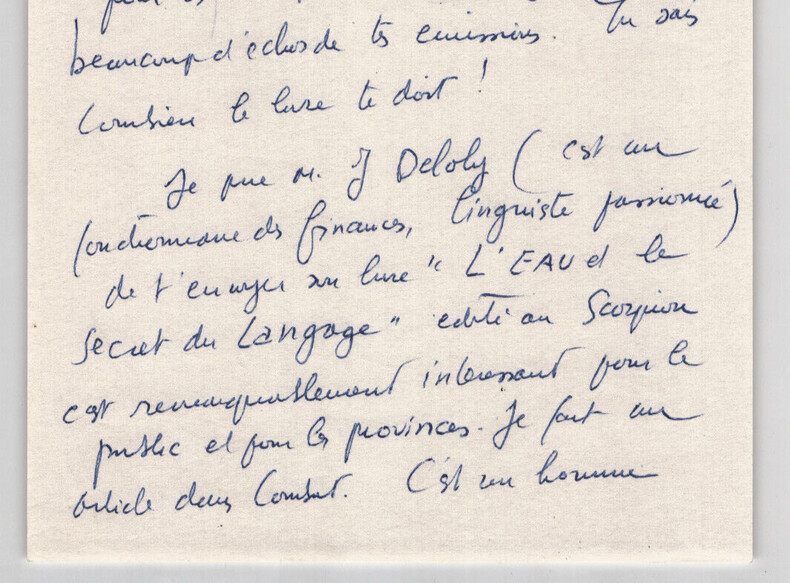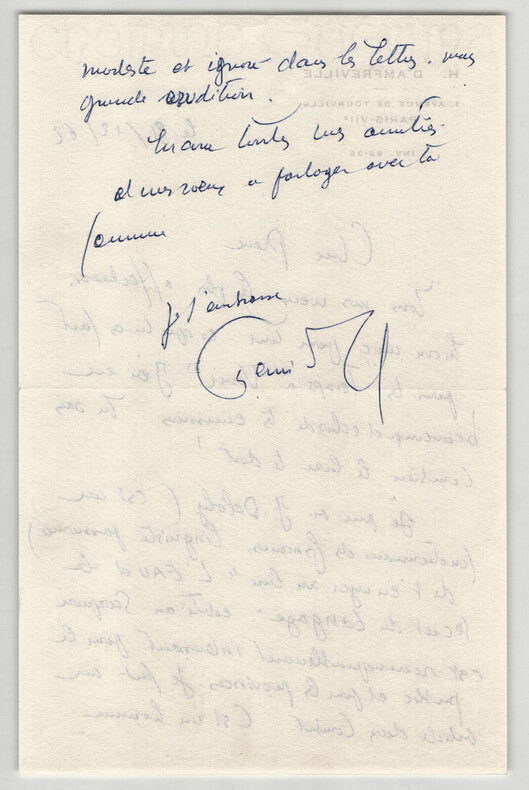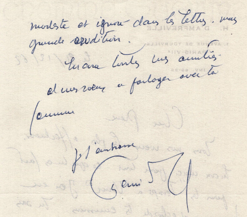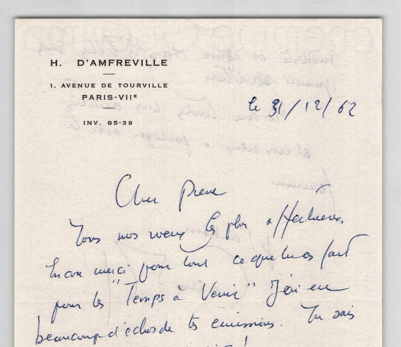 Henri d' Amfreville - Poète - Lettre autographe signée, Paris le 31/12/1962 Poète Henri d'Amfreville indique qu'il demande à J. DELOLY de lui envoyer "L'eau et le secret du langage". Dimensions : 21 x 13,5 cm État : Voir photos et description pour plus de détails. Nombre de pages : 2 Henri d'Amfreville Henri d'Amfreville est un romancier, poète et peintre français. Il collabore à La Revue Française et il est l'auteur de plusieurs ouvrages : Terre de rêve, Les fanatiques (1937), Les solitaires (1943), L'homme nu (1955), Le naufrage des sexes (1957), Eoliennes : épopée de l'air (1968).