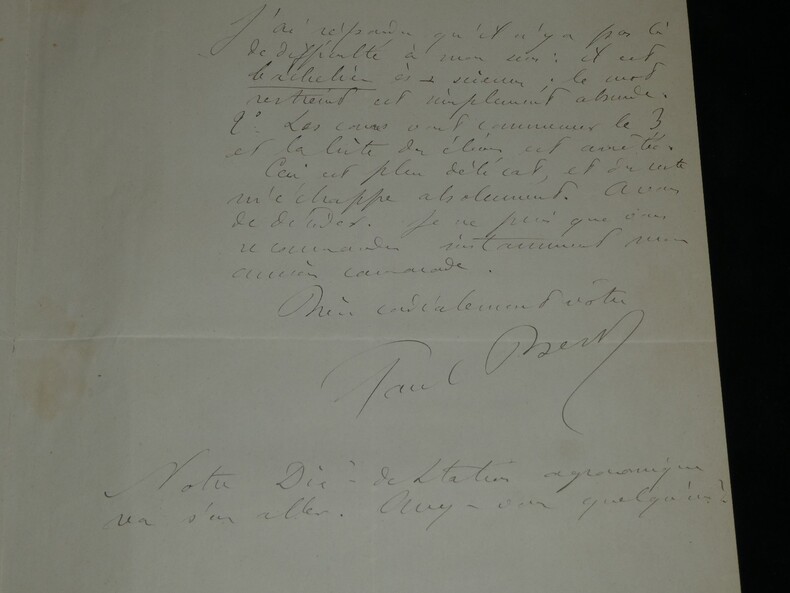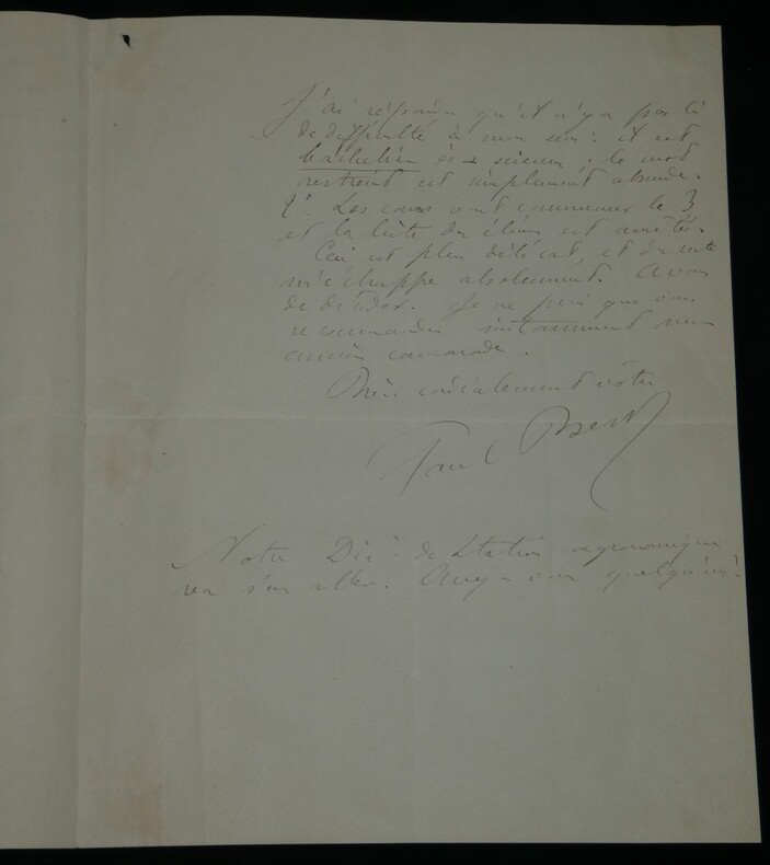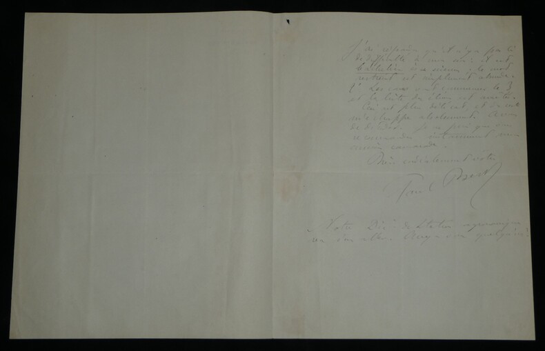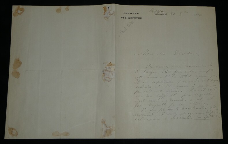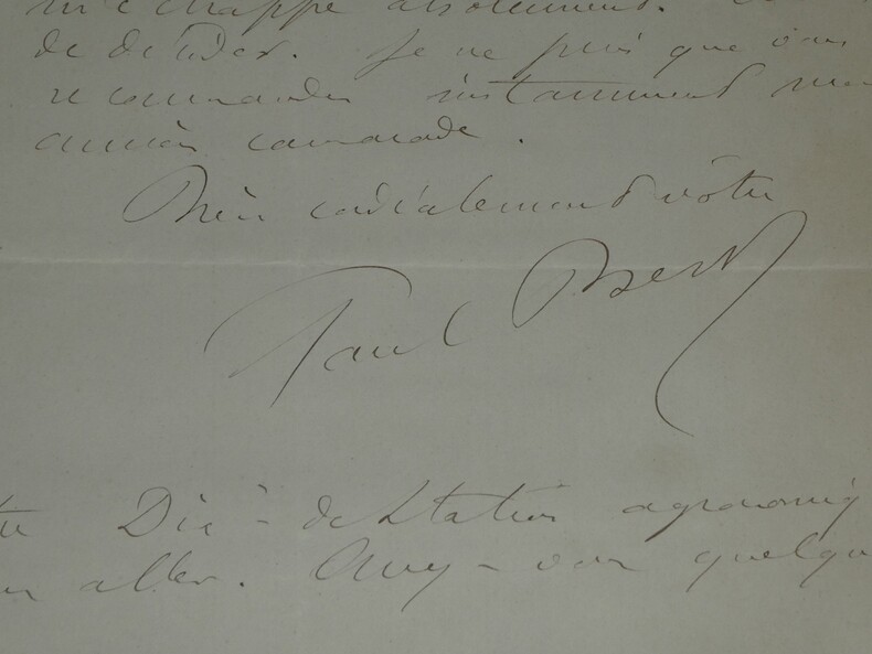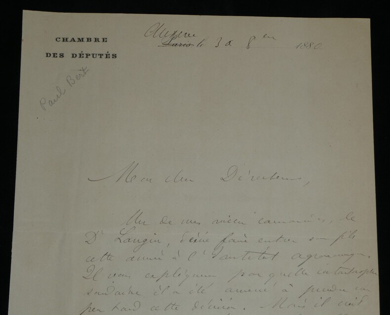 **Paul Bert. Lettre autographe signée à Eugène Risler, Chambre des députés, 1880** Médecin, physiologiste et homme politique français Lettre autographe signée de Paul Bert, datée du 30 octobre 1880 à Auxerre, rédigée à l'encre brune sur un double feuillet de papier vélin filigrané, avec entête de la Chambre des députés. Lettre adressée à Eugène Risler (1831-1916), alors directeur de l Institut agronomique de Paris, dans laquelle Paul Bert recommande le fils d un de ses anciens camarades, le Dr Langin, pour une admission tardive à l Institut : "Mon cher Directeur, Un de mes vieux camarade, le Dr Langin, désire faire entrer son fils cette année à l'Institut agronomique. Il vous explique par quelle catastrophe soudaine il a été amené à prendre un peu tard cette décision. [...]" Dimensions : 21 x 26,9 cm État : Voir photos et description pour plus de détails. Nombre de pages : 2 pages Paul Bert Paul Bert, né le 19 octobre 1833 à Auxerre et mort le 11 novembre 1886 à Hanoï, est un médecin, physiologiste et homme politique français. Wikipédia