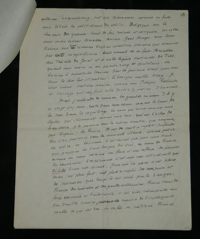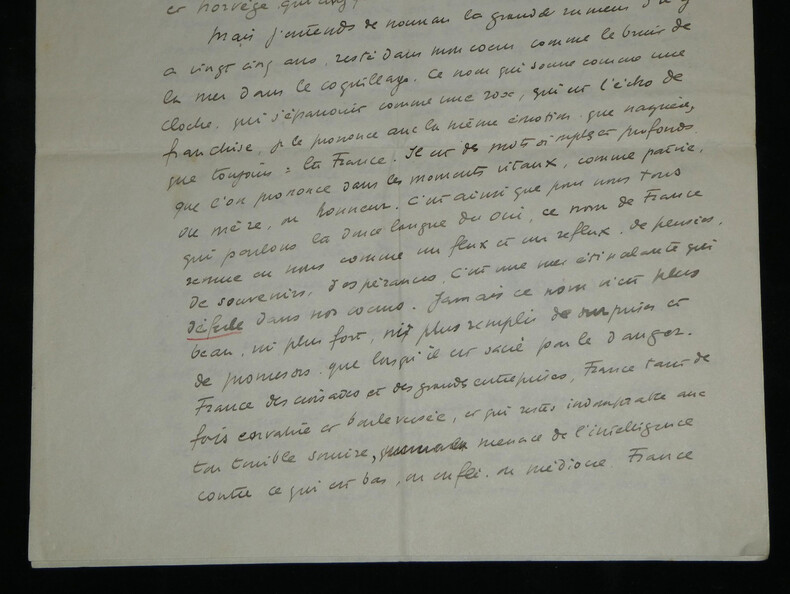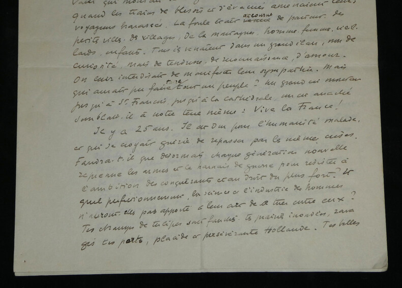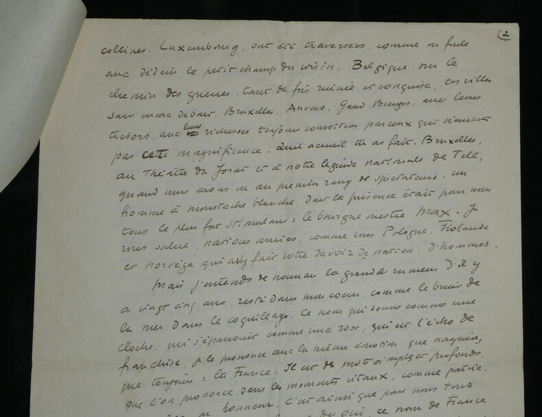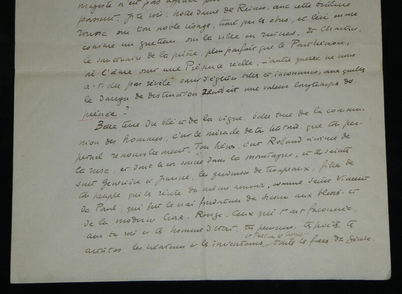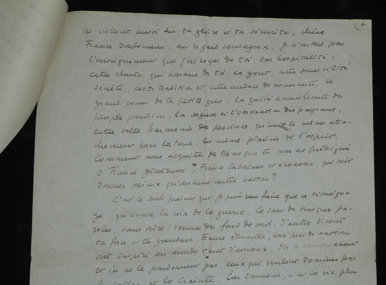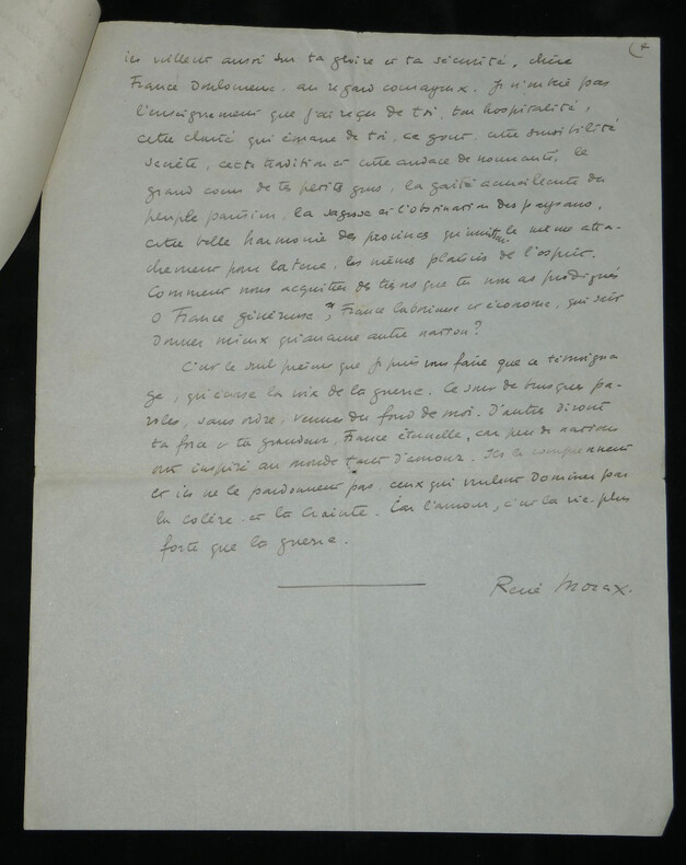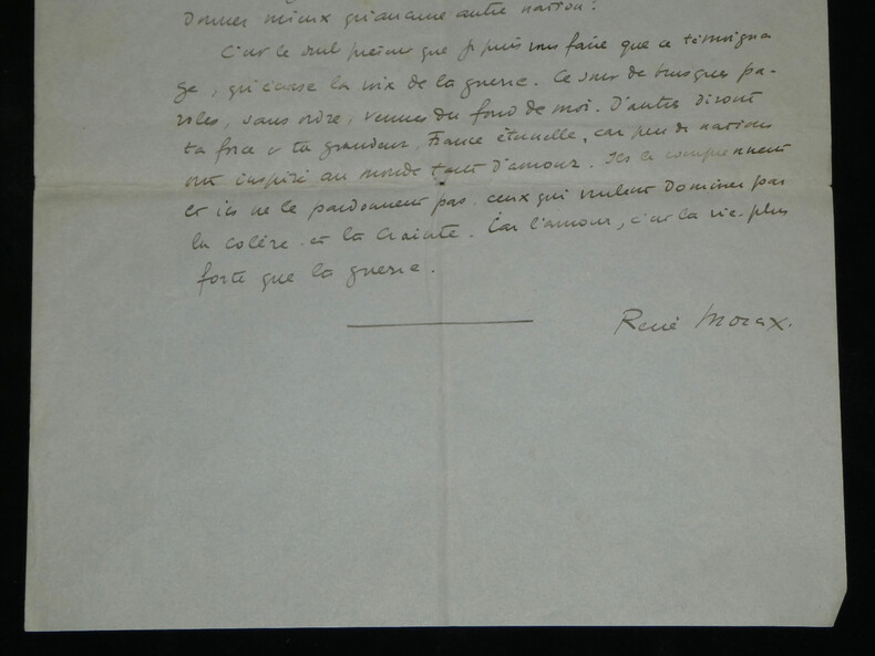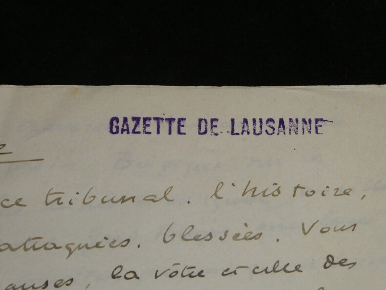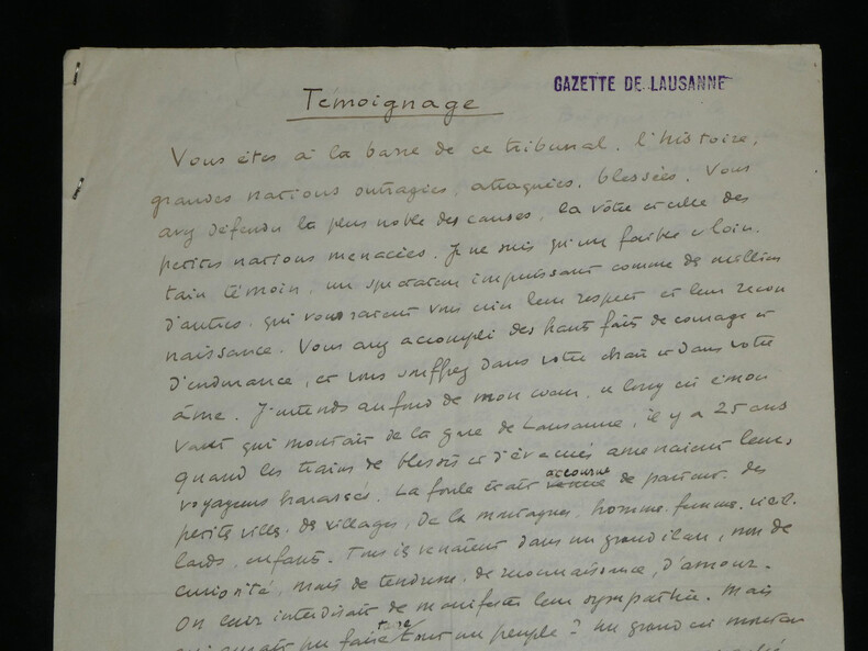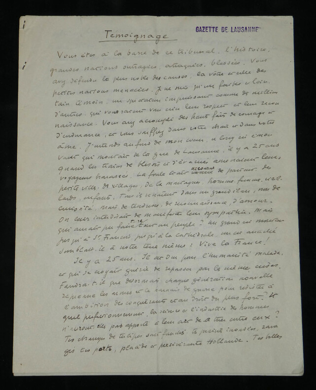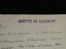 René Morax. Manuscrit autographe signé, Témoignage, Guerre Écrivain, et dramaturge vaudois Manuscrit autographe signé de René Morax, de 4 pages, intitulé "Témoignage". Rédigée à l'encre brune sur 4 feuillets de papier vélin. Avec tampon humide de la Gazette de Lausanne. Ce texte, intitulé "Témoignage" , est un plaidoyer vibrant et empreint d'une grande ferveur francophile, rédigé au début de la Seconde Guerre mondiale. Morax y dresse un parallèle poignant entre l'accueil des blessés français à la gare de Lausanne en 1914 et la tragédie qui frappe à nouveau la "France éternelle". Morax s'adresse directement aux "grandes nations outragées". Il évoque avec émotion le souvenir de 1914 ("il y a 25 ans") et l'élan de solidarité du peuple vaudois. Il interroge la répétition de l'Histoire et dénonce l'ambition des conquérants face à l'amour, qu'il définit comme "la vie plus forte que la guerre". « Témoignage Vous êtes à la barre de ce tribunal, l'histoire, grandes nations outragées, attaquées, blessées. Vous avez défendu la plus noble des causes, la vôtre et celle des petites nations menacées. Je ne suis qu'un faible et lointain témoin, un spectateur impuissant comme des millions d'autres, qui [...] vous crient leur respect et leur reconnaissance. Vous avez accompli des hauts faits de courage et d'endurance, et vous souffrez dans votre chair et dans votre âme. J'entends au fond de mon cœur, ce long cri émouvant qui montait de la gare de Lausanne, il y a 25 ans quand les trains de blessés et d'évacués amenaient leurs voyageurs harassés. La foule était accourue de partout, des petites villes, des villages, de la montagne, hommes et femmes, vieillard, enfants. Tous ils venaient dans un grand élan, non de curiosité, mais de tendresse, de reconnaissance, d'amour. On leur interdisait de manifester leur sympathie. Mais qui aurait pu faire taire tout un peuple ? Un grand cri [menant] jusqu'à St François, jusqu'à la cathédrale, un cri arraché semblait-il à notre terre même : Vive la France ! Il y a 25 ans. Il est dur pour l'humanité malade, et qui se croyait guérie de repasser par les mêmes crises. Faudra-t-il que désormais chaque génération nouvelle reprenne les armes et le harnais de guerre pour résister à l'ambition des conquérants et au droit des plus forts ? [...] C'est le seul présent que je puis vous faire que ce témoignage, qu'écrase la voix de la guerre. Ce sont de brusques paroles, sans ordre, venues du fond de moi. D'autres diront ta force et ta grandeur, France éternelle, car peu de nations ont inspiré au monde tant d'amour. Ils le comprennent et ils ne le pardonnent pas, ceux qui veulent dominer par la colère et la crainte. Car l'amour, c'est la vie plus forte que la guerre. » Dimensions : 21 x 27 cm État : Voir photos et description pour plus de détails. Nombre de pages : 4 pages