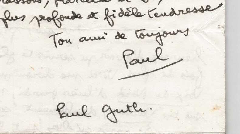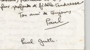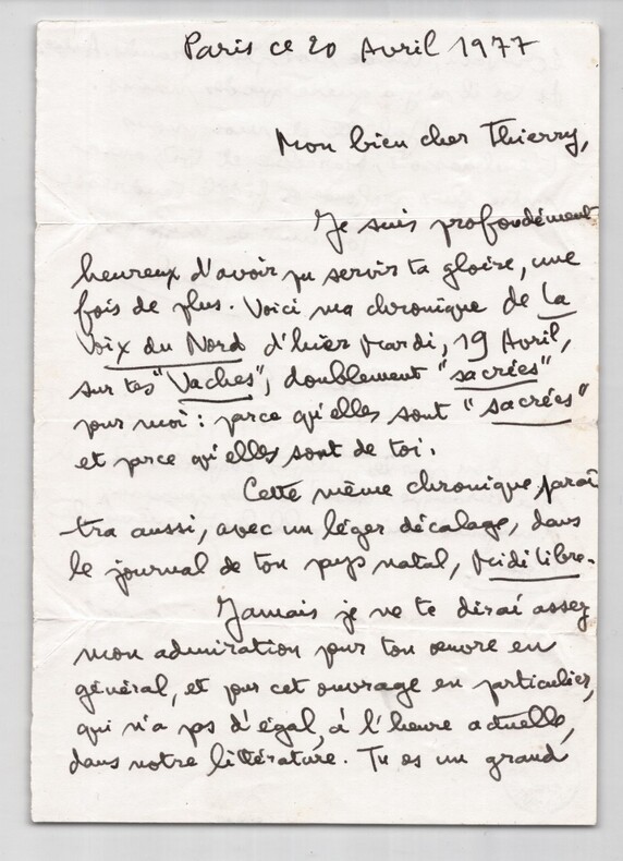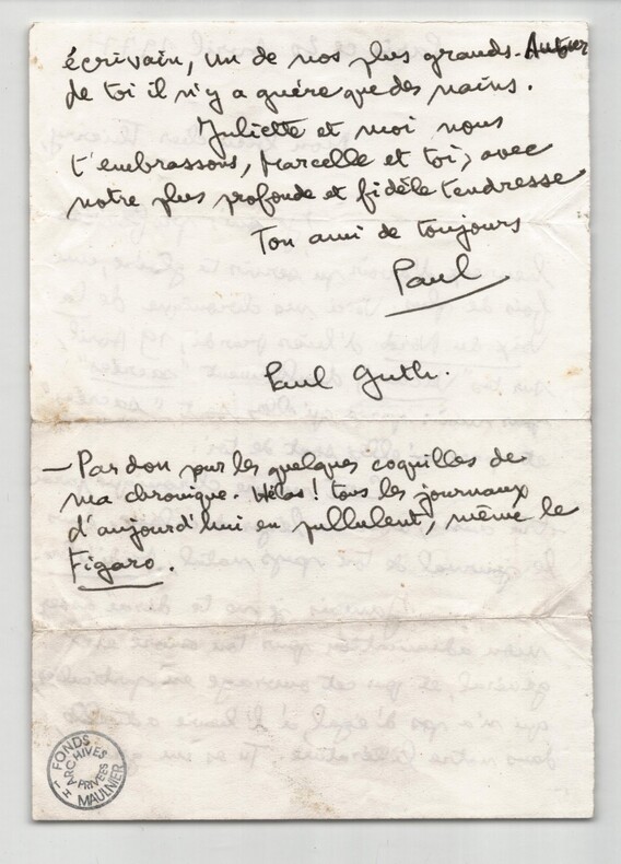 Paul Guth - Lettre autographe signée élogieuse pour "les vaches sacrées" à Thierry Maulnier 20 avril - 1977 Écrivain Belle lettre autographe signée de l écrivain, chroniqueur et académicien Paul Guth (1910 1997), adressée à son confrère Thierry Maulnier (1909 1988), écrivain, journaliste et membre de l Académie française. Témoignage d admiration littéraire et d amitié entre deux grandes figures des lettres françaises du XXe siècle. Datée de Paris, le 20 avril 1977, cette lettre de deux pages est écrite à l encre noire sur un feuillet double. Paul Guth y évoque une chronique parue dans La Voix du Nord du 19 avril, consacrée à l ouvrage Les Vaches de Maulnier, qu il qualifie de « doublement sacrées » et loue avec une chaleur rare : « Jamais je ne te dirai assez mon admiration pour ton uvre en général, et pour cet ouvrage en particulier, qui n a pas d égal, à l heure actuelle, dans notre littérature. » Guth signe « Ton ami de toujours, Paul », ajoutant une note manuscrite humoristique sur les coquilles typographiques dans la presse contemporaine. Détail intéressant : la lettre porte le tampon Fonds Archives Privées Maulnier, témoignant de son origine et de sa conservation au sein du fonds personnel de Thierry Maulnier. Dimensions : 21 x 13.5 cm État : Bon état général, pli d envoi, légères marques d usage. Voir photos. Nombre de pages : 2 pages Enveloppe : Non présente Signature : Autographe signée « Paul », puis nom complet « Paul Guth » Remarque : Belle pièce d amitié littéraire, illustrant les liens entre deux académiciens, unie à un contexte journalistique (la chronique évoquée), avec des propos chaleureux et personnels. Un document révélateur de l admiration d un écrivain pour un autre.