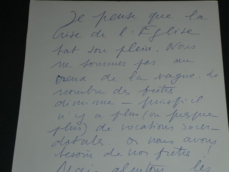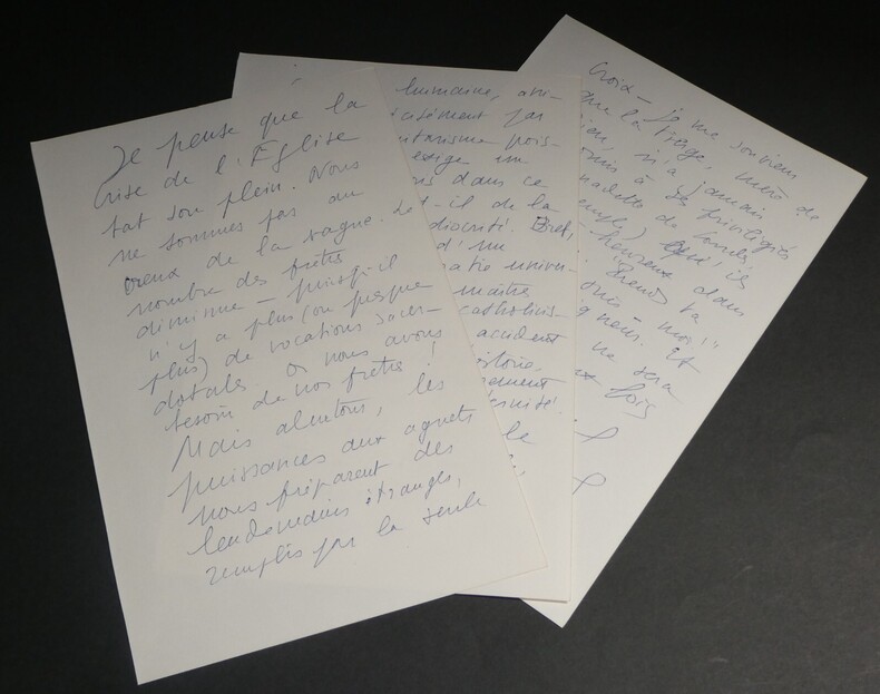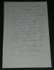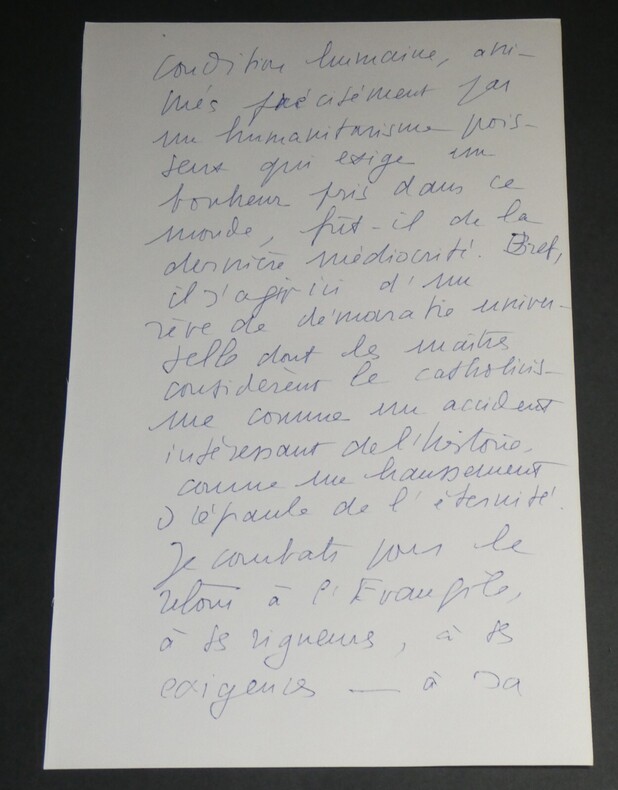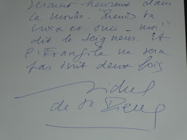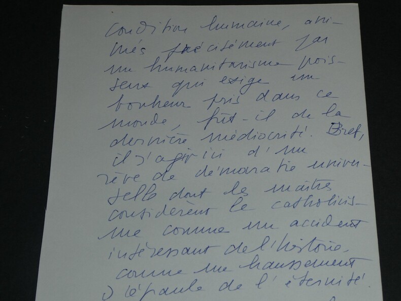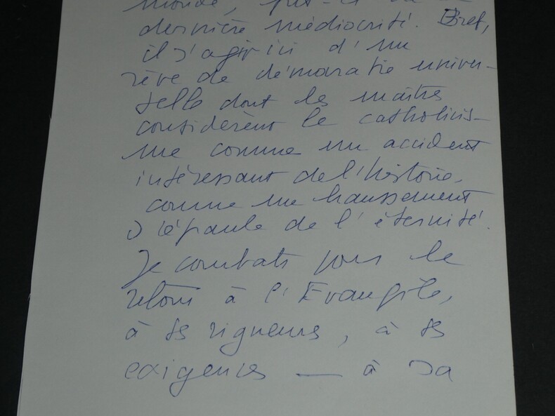 Michel DE SAINT PIERRE Liste autographes signée 3 pages XXème siècle Écrivain, Journaliste, Résistant Liste autographes signée de 3 pages de Michel DE SAINT PIERRE écrivain et journaliste français disant "Je pense que la crise de l'Eglise bat son plein." Apparemment à l'époque "le nombre de prêtres diminue [...] or nous avons besoin de nos prêtres". "Bref il s'agit ici d'un rêve de démocratie universelles dont les maîtres considèrent le catholicisme comme un accident intéressant de l'histoire." Dimensions : 24,2 x 15,4 cm État : Voir photos pour plus de détails. Nombre de pages : 3 Michel DE SAINT PIERRE Michel de Grosourdy de Saint-Pierre, né le 12 février 1916 à Blois et mort le 19 juin 1987 à Saint-Pierre-du-Val, est un écrivain et journaliste français, résistant pendant la Seconde Guerre mondiale, puis engagé politiquement en faveur d'options catholiques traditionalistes et conservatrices.
