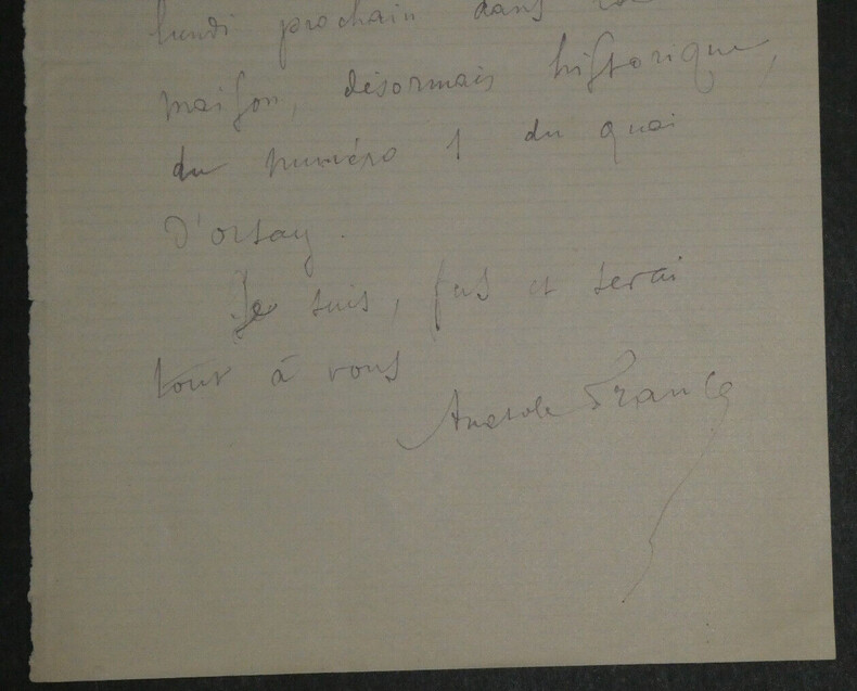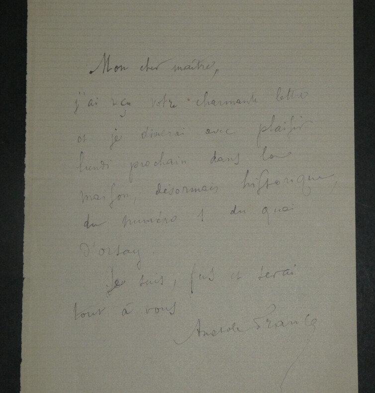 Anatole France. Lettre autographe signée [à Mon cher maître. Quai d'Orsay] Lettre autographe signée, adressée à Mon cher maître. Non datée. "Mon cher maître, J'ai reçu votre charmante lettre et je dinerai avec plaisir lundi prochain dans la maison, désormais historique, du numéro 1 du quai d'Orsay. Je suis, fus et serai tout à vous." Dimensions : 17,9 x 11,6 cm État : Voir photos pour plus de détails. Nombre de pages : 1 page Anatole FRANCE Anatole France, pour l'état civil François Anatole Thibault, né le 16 avril 1844 à Paris et mort le 12 octobre 1924 à Saint-Cyr-sur-Loire, est un écrivain français. Il est considéré comme l un des plus grands de l'époque de la Troisième République, dont il a également été un des plus importants critiques littéraires. Wikipédia Lettres autographes, vieux papiers, livres anciens, photographies, gravures, timbres... Nous expertisons et/ou rachetons dans toute la France vos lettres, collections de lettres et livres anciens.