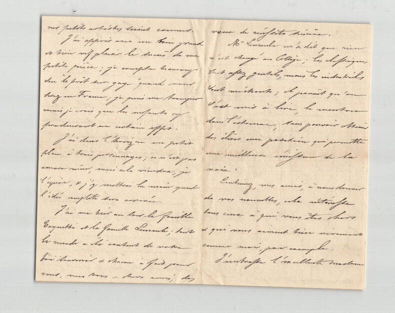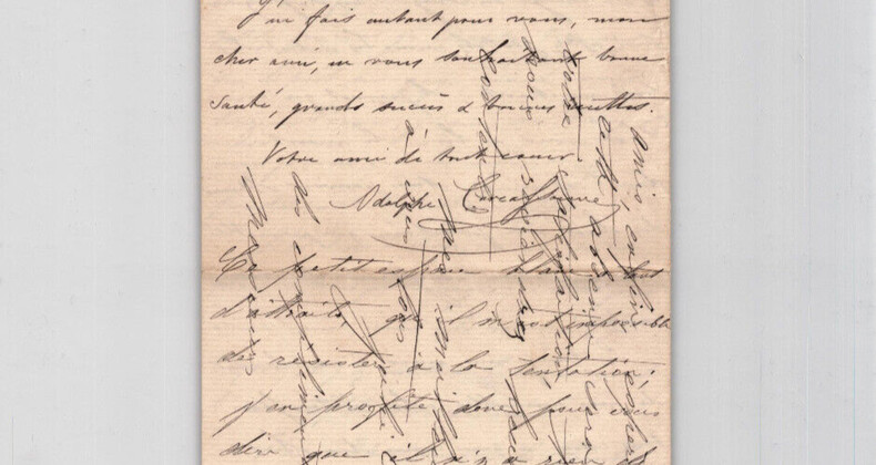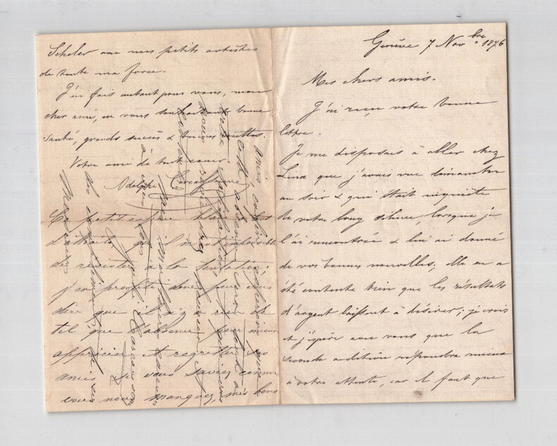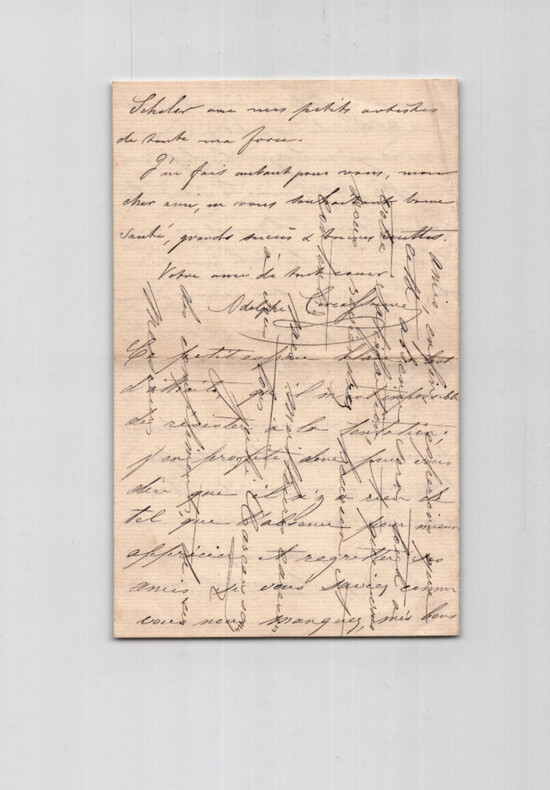Adolphe Joseph Carcassonne. Lettre autographe signée à Monsieur Alphonse Scheler, 1876 Auteur dramatique et militant républicain français Lettre autographe signée d'Alphonse Joseph Carcassonne, adressée à Monsieur Alphonse Scheler et son épouse, datée du 7 novembre 1876, écrite à l'encre noire sur un double feuillet de papier vergé filigrané. "Mes chers amis, [...] j'ai dans l'horizon un petit plan à trois personnages ; ce n'est pas encore mûr, mais cela viendra, je l'espère, & j'y mettrai la main quand l'idée complète sera arrivée. [...] Continuez, mes amis, à nous donner de vos nouvelles, cela intéresse tous ceux à qui vous êtes chers & qui vous aiment bien vivement comme moi, par exemple. J'embrasse l'excellente Madame Scheler, avec mes petits artistes de toute ma force. [...] Ce petit espace blanc a tant d'attraits, qu'il m'est impossible de résister à la tentation ; j'en profite donc pour vous dire qu'il n'y a rien de tel que l'absence pour mieux apprécier et regretter ses amis, si vous saviez comme vous nous manquez, mes bons amis, enfin, espérons que cette absence sera tout à votre satisfaction et que vous nous reviendrez heureux et contents. [...]" Dimensions : 11,2 x 18 cm État : Voir photos et description pour plus de détails. Nombre de pages : 4 pages
