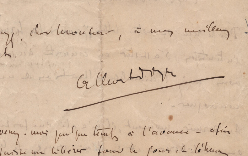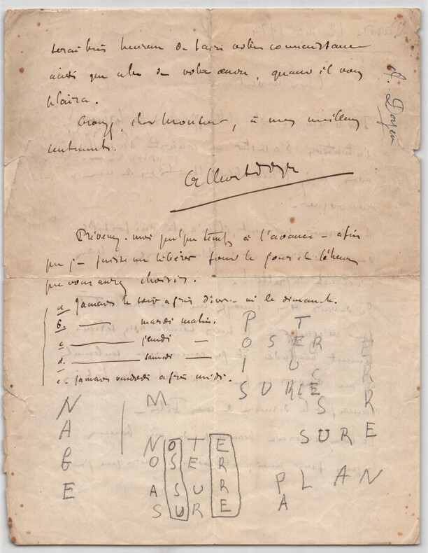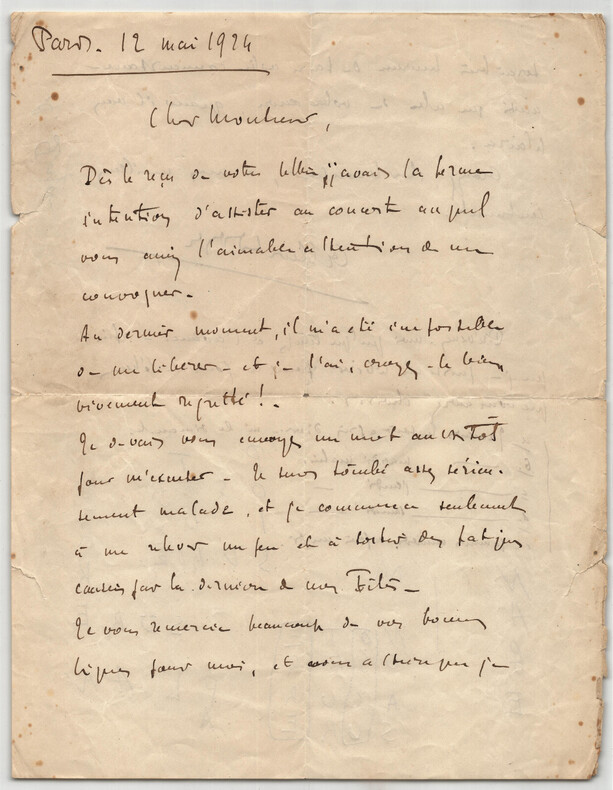 Albert Doyen. Lettre autographe signée, 1924 Musicien français Lettre autographe signée d' Albert Doyen, datée du 12 mai 1924 à Paris, écrite à l'encre brune sur un feuillet de papier vélin. Il regrette vivement de ne pas avoir pu assister au concert auquel il avait été invité par son correspondant, il a été sérieusement malade, puis il lui donne ses disponibilités pour être sur de pouvoir se libéré la prochaine fois. Dimensions : 21 x 27 cm État : Papier froissé et avec de petites déchirures par endroit. Annotations au crayon au dos de la lettre. Voir photos pour plus de détails. Nombre de pages : 2 pages