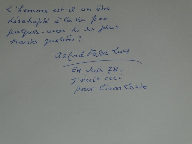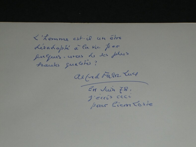 Alfred FABRE-LUCE Pensée autographe signée en 1978 1 page Écrivain, Journaliste Pensée autographe signée d'Alfred FABRE-LUCE en 1978 "L'homme est il un être désadopté à la vie" 1 page Dimensions : 24,2 x 15,3 cm État : Voir photos pour plus de détails. Nombre de pages : 1 Alfred FABRE-LUCE Alfred Fabre-Luce, né à Paris le 16 mai 1899 et mort dans cette même ville le 17 mai 1983, est un journaliste et écrivain français. Wikipédia