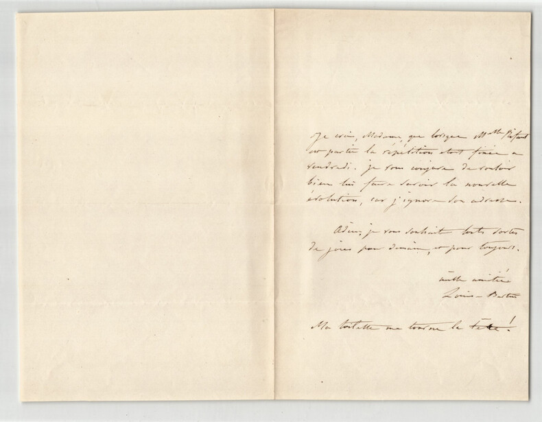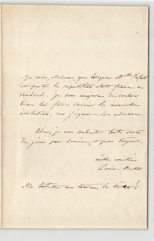 Louise Bertin. Lettre autographe signée Poétesse française Louise Bertin (1805-1877) était une compositrice et femme de lettres française. Issue d une famille influente, elle a bénéficié d une éducation musicale privilégiée et a composé plusieurs opéras, dont La Esmeralda, basé sur Notre-Dame de Paris de Victor Hugo, avec qui elle entretenait une relation amicale. Elle est l une des rares compositrices de son époque à avoir vu ses uvres jouées à l Opéra de Paris. Dans cette lettre, elle mentionne une répétition prévue un vendredi et demande à sa correspondante d informer Mlle [Mitant] des changements, car elle ne connaît pas son adresse. Elle conclut avec des v ux amicaux et une remarque humoristique sur sa toilette, suggérant peut-être l agitation précédant un événement important. "Ma toilette me tourne la tête !" Rappel dimensions : 13,1 x 20 cm État : Voir photos pour plus de détails. Nombre de pages : 1 page, non datée 1860 estimé.