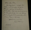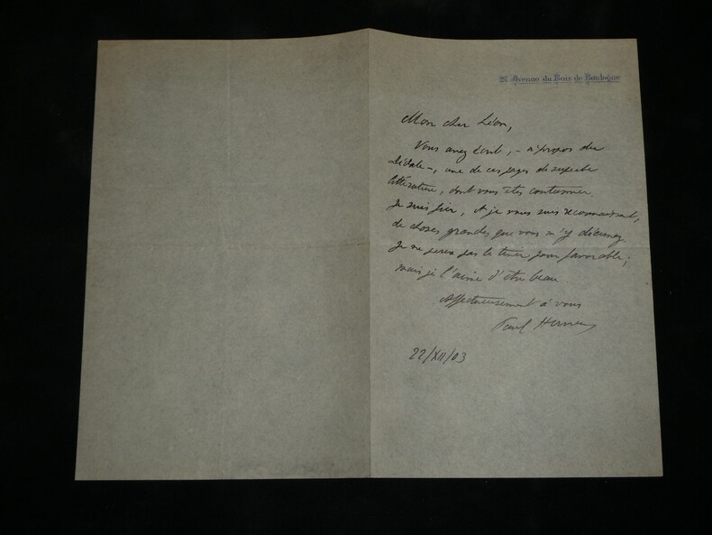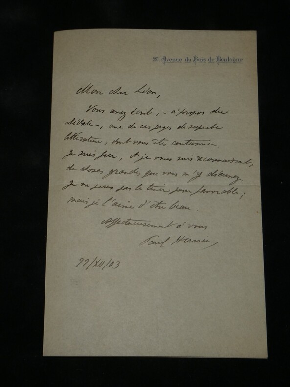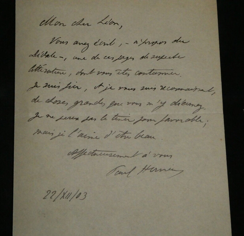 Paul HERVIEU. Lettre autographe signée en date du 22 décembre 1903 à Léon DAUDET. Romancier Lettre autographe signée de Paul Hervieu, adressée à Léon Daudet, datée du 22 décembre 1903, écrite à l'encre noire sur un double feuillet de papier vélin avec son adresse en entête, à propos de sa pièce de théâtre "Le Dédale" présentée pour la première fois en 1903. "Mon cher Léon, Vous avez écrit, à propos du Dédale, une de ces pages de superbe littérature, dont vous êtes coutumier. Je suis fier, et je vous suis reconnaissant, de choses grandes que vous m'y décernez. Je ne peux pas le tenir pour favorable ; mais je l'aime d'être beau. Affectueusement à vous." Dimensions : 18 x 11,5 cm État : Papier fin. Voir photos et description pour plus de détails. Nombre de pages : 1 page
