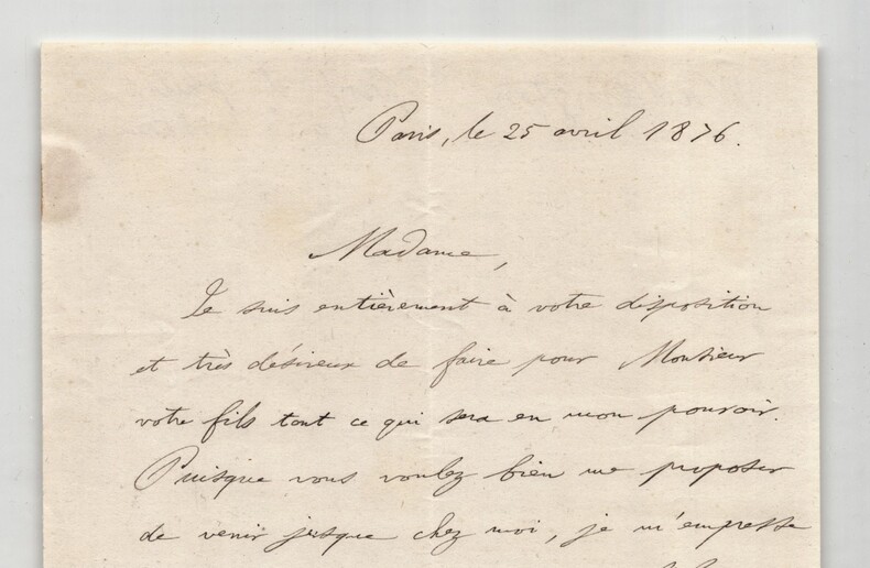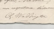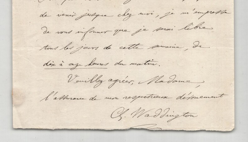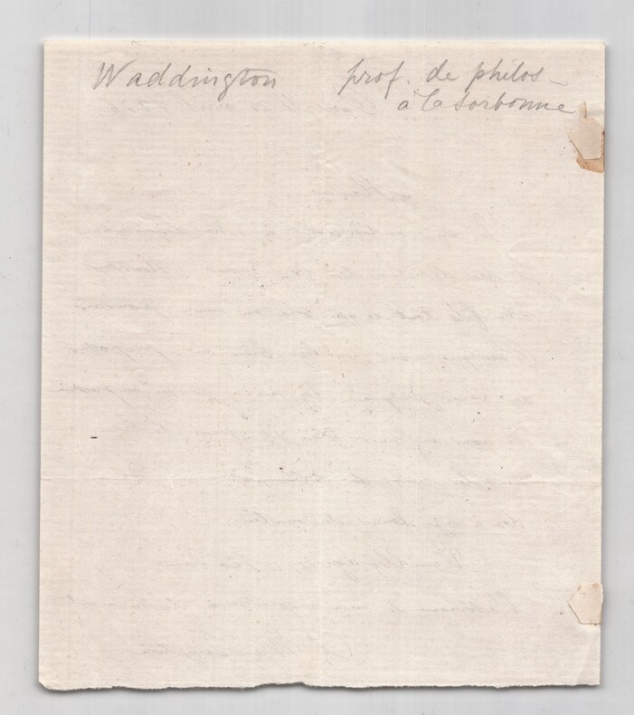 Charles-Pendrell Waddington - Lettre autographe signée - Paris, 1876 Philosophe français Lettre autographe signée de Charles-Pendrell Waddington, philosophe français, datée du 25 avril 1876 à Paris. Rédigée à l'encre noire sur un feuillet de papier vergé. "Madame, Je suis entièrement à votre disposition et très désireux de faire pour Monsieur votre fils tout ce qui sera en mon pouvoir. Puisque vous voulez bien me proposer de venir jusque chez moi, je m'empresse de vous informer que je serai libre tous les jours de cette semaine, de dix à onze heures du matin. Veuillez agréer, Madame, l'assurance de mon respectueux dévouement." Dimensions : 13,5 x 15,5 cm État : Voir photos et description pour plus de détails. Nombre de pages : 1 page Charles-Pendrell Waddington Charles-Pendrell Waddington, né le 19 juin 1819 à Milan, en Italie, et mort le 18 mars 1914 à Saint-Georges-Buttavent, est un philosophe français, cousin de Richard et de William H. Waddington. Wikipédia