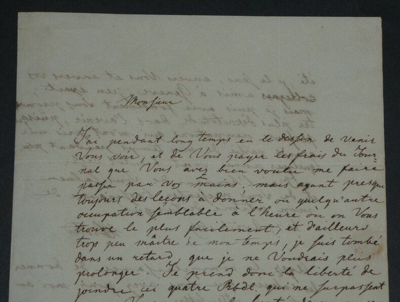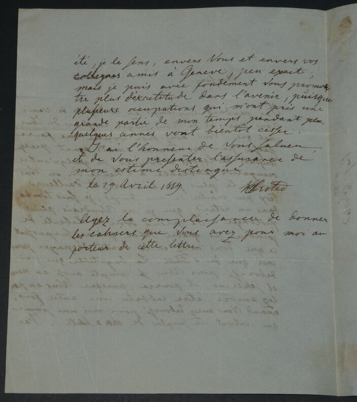 Hans Christian Orsted (Ørsted). Belle et longue lettre autographe signée à Marc Nicolas Puerari,1819 Physicien et chimiste danois Lettre autographe signée de Hans Christian Orsted (Ørsted), datée 29 avril [1819]. Adressée à Marc Nicolas Puerari, botaniste suisse ayant fait carrière au Danemark. Rédigé à l'encre brune sur un double feuillet de papier vélin. "Monsieur, J'ai pendant longtemps eu le dessin de venir vous voir, et de vous payer les frais du journal que vous avez bien voulu me faire passer par vos mains ; mais ayant presque toujours des leçons à donner ou quelqu'autre occupation semblable à l'heure où on vous trouve le plus facilement, et d'ailleurs trop peu maître de mon temps, je suis tombé dans un retard, que je ne voudrais plus prolonger. Je prend donc la liberté de joindre ici quatre Rbdl qui ne surpassent ce que vous avez eu la bonté de payer pour moi que de 4 Schill. La bagatelle que j'ai déboursé pour vous se compte aussi en Mark et schilling, et pourra, puisque vous en parlez encore, être rabbatu une autre fois, quand vous aurez déboursé pour moi une somme qui contient un surplus de Mk & Schill. J'ai été, je le sens, envers vous et envers vos collègues amis à Genève, peu exact ; mais je puis avec fondement vous promettre plus d'exactitude dans l'avenir, puisque plusieurs occupations qui m'ont pris une grande partie de mon temps pendant quelques années vont bientôt cesser. J'ai l'honneur de vous saluer et de vous présenter l'assurance de mon estime distinguée. Ayez la complaisance de donner les cahiers que vous avez pour moi au porteur de cette lettre." Une lettre révélatrice des contraintes de temps d un savant en pleine activité, rédigée peu avant sa découverte capitale de l interaction entre électricité et magnétisme (1820), moment fondateur de la physique moderne. Dimensions : 20 x 24,8 cm État : Traces d'onglet au dos sinon bel état de conservation. Voir photos et description pour plus de détails. Nombre de pages : 2 pages