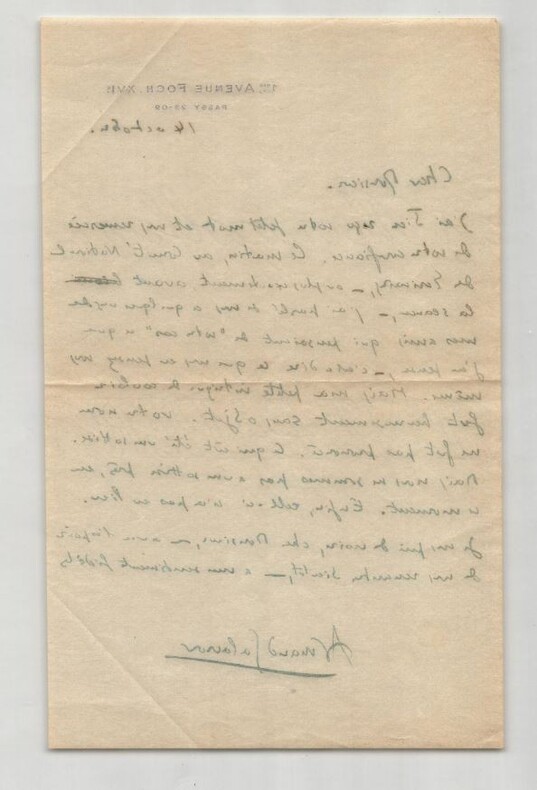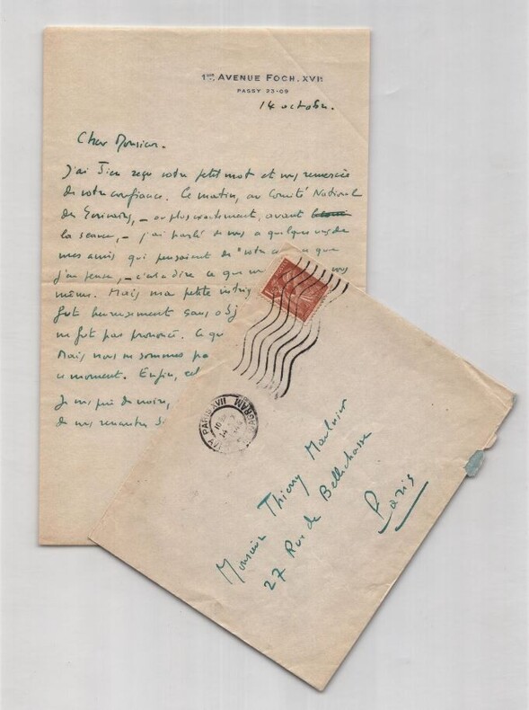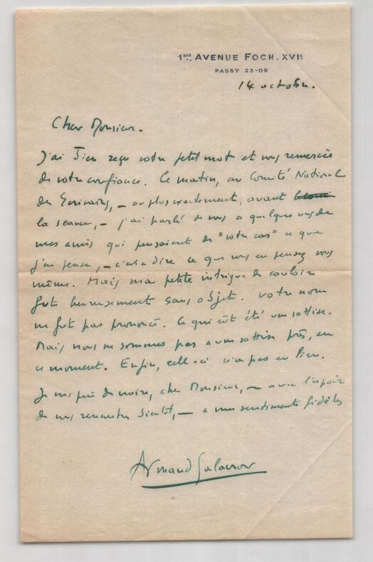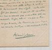 Armand Salacrou, Lettre autographe signée à Thierry Maulnier sur un Comité 1946 Lettre autographe signée d Armand Salacrou, datée du 14 octobre [1946], adressée à Thierry Maulnier. Une page in-8 à l encre verte sur papier à en-tête imprimé « 1bis, Avenue Foch XVIe Passy 23-09 », avec son enveloppe affranchie et timbrée du même jour. Dans cette lettre, Salacrou rapporte une tentative d'intervention en faveur de Thierry Maulnier auprès de plusieurs membres influents du Comité National des Écrivains : « Ce matin, au Comité National des Écrivains ou plus exactement, avant la séance j ai parlé de vous à quelques-uns de mes amis qui présidaient de votre cas [ ]. Mais ma petite intrigue de coulisse fut heureusement sans objet : votre nom ne fut pas prononcé. Ce qui eût été une sottise. Mais nous ne sommes pas à une sottise près, en ce moment. Enfin, celle-ci n a pas eu lieu. » Il conclut par une formule empreinte d estime : « Je vous prie de croire, cher Monsieur, avec l espoir de vous rencontrer bientôt, à mes sentiments fidèles. » Dimensions : 21 x 13.4 cm État : Voir photos et description pour plus de détails. Nombre de pages : 1