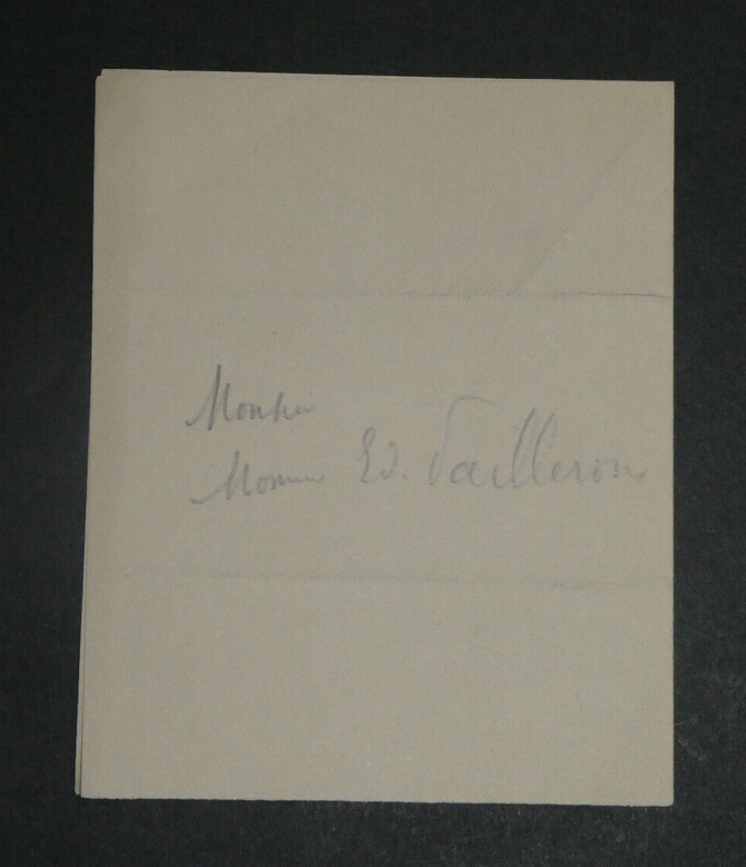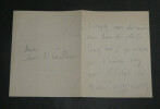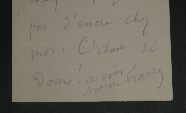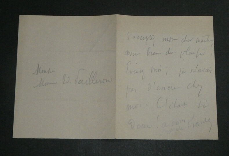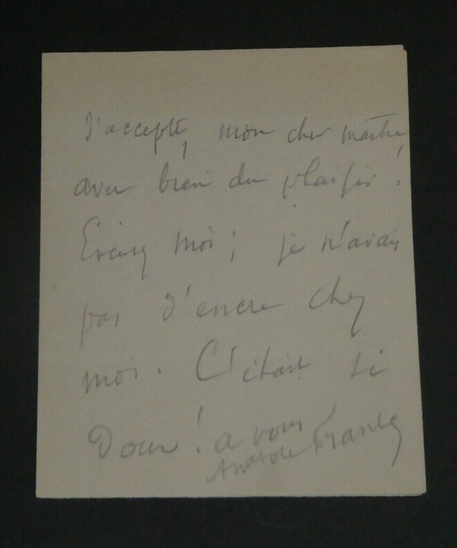 Anatole France. Lettre autographe signée à un certain Monsieur [Vailleron] Lettre autographe signée, adressée à un certain Monsieur [Vailleron]. Non datée. "J'accepte mon cher maitre avec bien du plaisir ! Excusez-moi ; je n'avais pas d'encre chez moi. C'était si doux ! A vous." Dimensions : 10,5 x 13,1 cm État : Voir photos pour plus de détails. Nombre de pages : 1 page Anatole FRANCE Anatole France, pour l'état civil François Anatole Thibault, né le 16 avril 1844 à Paris et mort le 12 octobre 1924 à Saint-Cyr-sur-Loire, est un écrivain français. Il est considéré comme l un des plus grands de l'époque de la Troisième République, dont il a également été un des plus importants critiques littéraires. Wikipédia Lettres autographes, vieux papiers, livres anciens, photographies, gravures, timbres... Nous expertisons et/ou rachetons dans toute la France vos lettres, collections de lettres et livres anciens.
