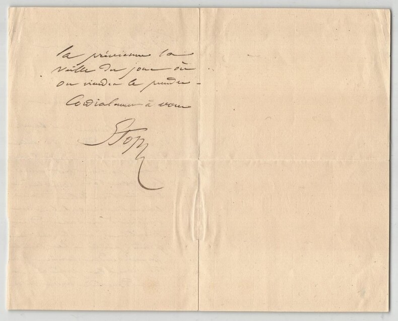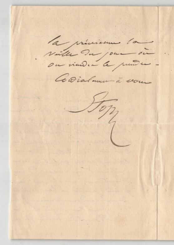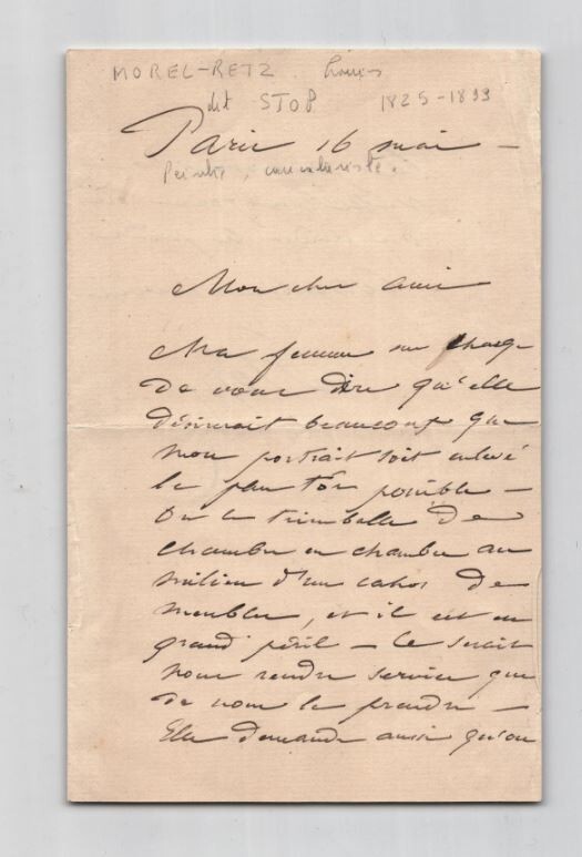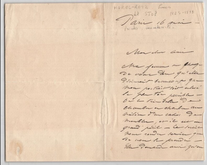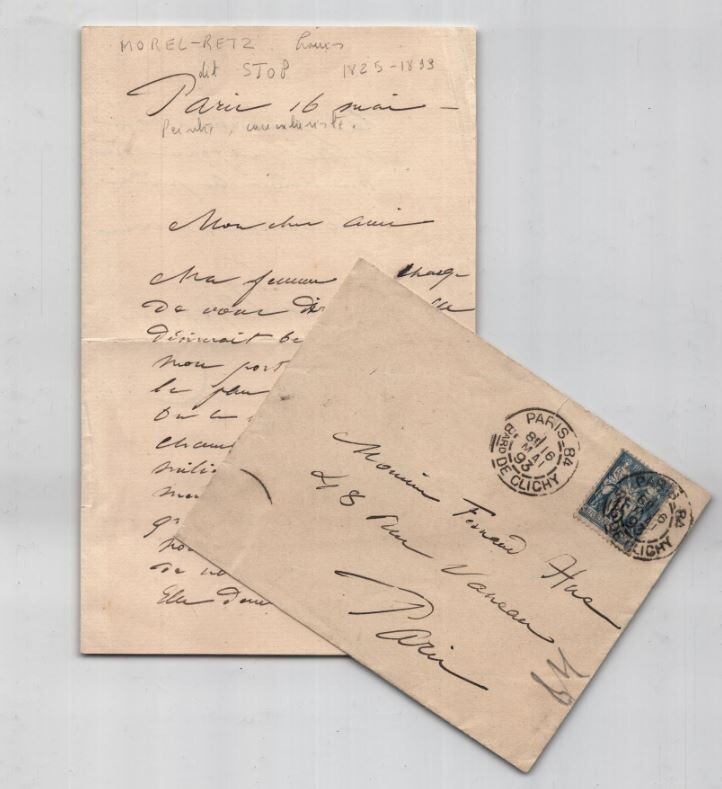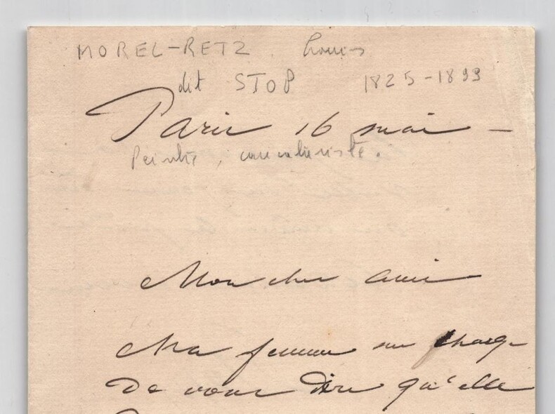 Louis Morel-Retz, dit Stop - Lettre autographe signée adressée à Fernand Hue Artiste Lettre autographe signée du dessinateur et caricaturiste Louis Morel-Retz, dit Stop, adressée à son ami Fernand Hue, datée du 16 mai 1893 (cachet postal faisant foi). Il transmet une demande de son épouse, qui souhaiterait récupérer un portrait exécuté par le destinataire, estimant qu il est exposé à des risques dans un intérieur encore non aménagé. Elle propose d en convenir ensemble et de venir le chercher. Lettre en bon état, malgré des plis de correspondance. Traces d onglets visibles au verso. Enveloppe conservée, affranchie et oblitérée à Paris le 16 mai 1893. Louis Morel-Retz (1825 1899), connu sous le pseudonyme Stop, fut un dessinateur, peintre et caricaturiste français. Collaborateur de journaux satiriques tels que Le Journal amusant et Le Charivari, il a laissé de nombreuses uvres humoristiques et illustratives, bien représentatives de la vie artistique du XIXe siècle. Témoignage de la relation amicale entre deux artistes et de la circulation d uvres dans le cadre privé. État : Voir photos et description pour plus de détails. Nombre de pages : 1 page Dimension : 11,1 x 17,6 cm Louis Morel-Retz Louis Pierre Gabriel Bernard Morel-Retz, dit Stop, est un artiste français aujourd'hui connu avant tout en tant que caricaturiste, dessinateur, illustrateur et graveur . Né le 3 juin 1825 à Dijon, il est mort dans la même ville le 4 septembre 1899. Louis Morel-Retz Wikipédia