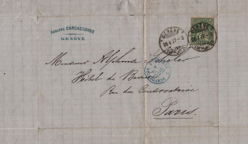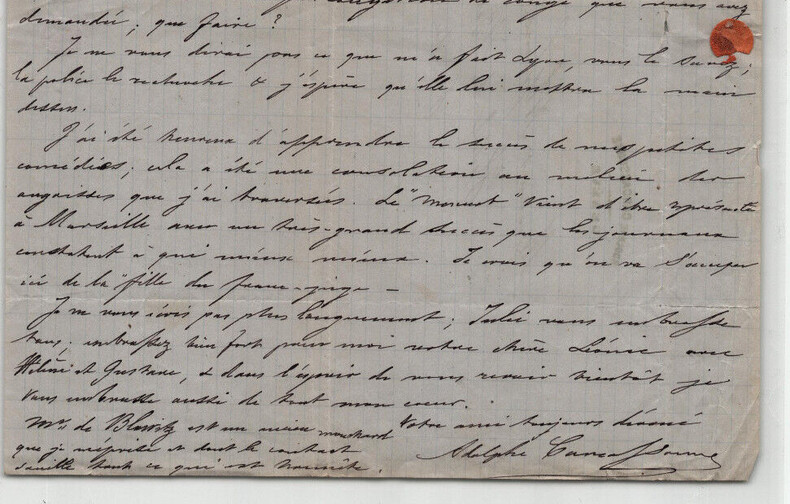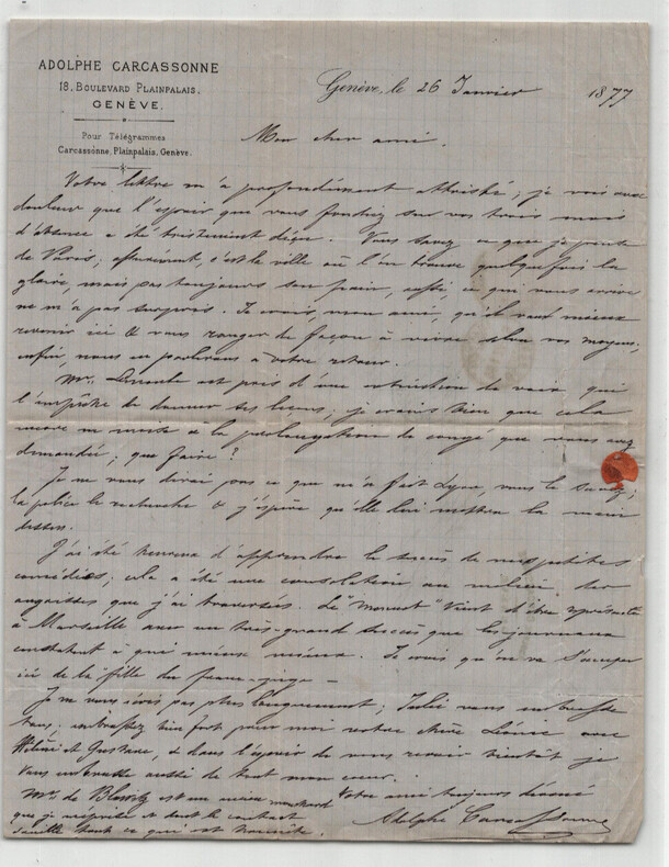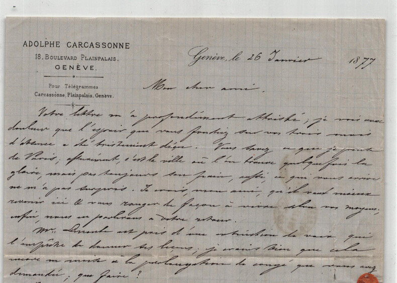 Adolphe Joseph Carcassonne. Lettre autographe signée à Monsieur Alphonse Scheler, 1877 Auteur dramatique et militant républicain français Lettre autographe signée d'Alphonse Joseph Carcassonne, adressée à Monsieur Alphonse Scheler, datée du 26 janvier 1877. Lettre écrite à l'encre noire sur un feuillet de papier vélin avec entête à son nom, timbrée et tamponnée au dos. "Mon cher ami, Votre lettre m'a profondément attristé, je vois avec douleur que l'espoir que vous fondiez sur vos trois mois d'absence a été tristement déçu. Vous savez ce que je pense de Paris ; assurément, c'est la ville où l'on trouve quelquefois la gloire, mais pour toujours son pain, aussi, ce qui vous arrive ne m'a pas surpris. Je crois, mon ami, qu'il vaut mieux revenir ici & vous ranger de façon à vivre selon vos moyens ; enfin, nous en parlerons à votre retour. [...] Je ne vous dirai pas ce que m'a fait Lyon, vous le savez ; la police le recherche & j'espère qu'elle lui mettra la main dessus. [...]" Dimensions : 20,7 x 26,4 cm État : Déchirure au niveau d'un pli de la lettre avec atteinte très légère du texte. Voir photos et description pour plus de détails. Nombre de pages : 1 page Adolphe Joseph Carcassonne Joseph Vidal Adolphe Carcassonne, né le 15 mars 1826 à Marseille et mort le 21 septembre 1891 dans le 1 arrondissement de Paris ou le 8 octobre 1894 à Marseille, est un auteur dramatique et militant républicain français. Wikipédia Lettres autographes, vieux papiers, livres anciens, photographies, gravures, timbres... Nous expertisons et/ou rachetons dans toute la France vos lettres, collections de lettres et livres anciens.