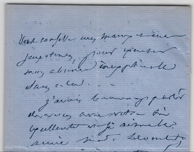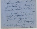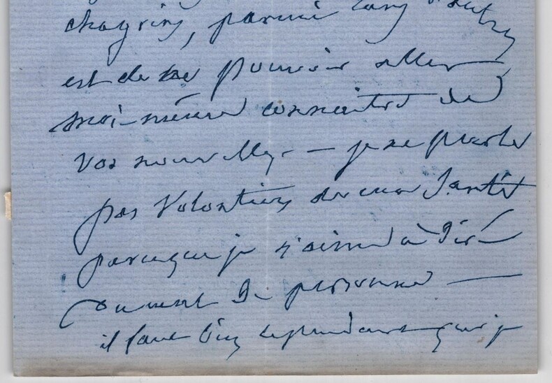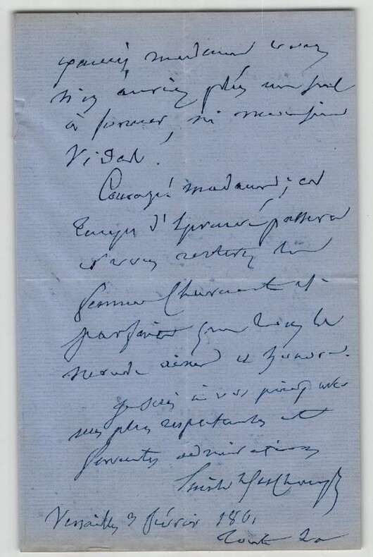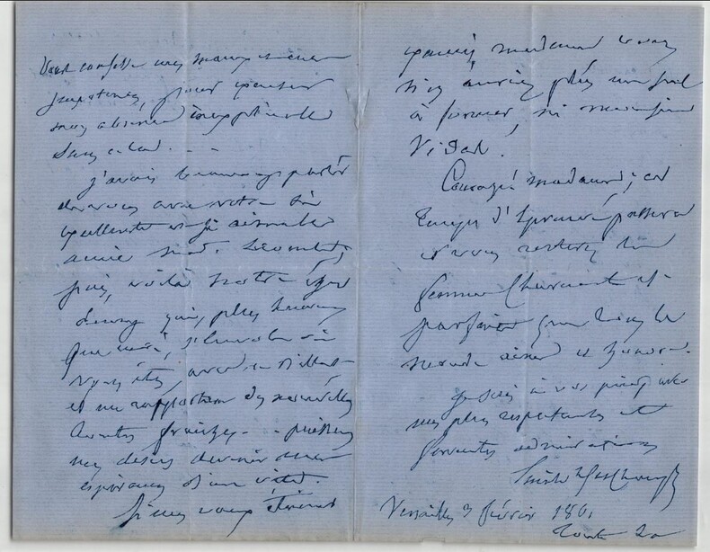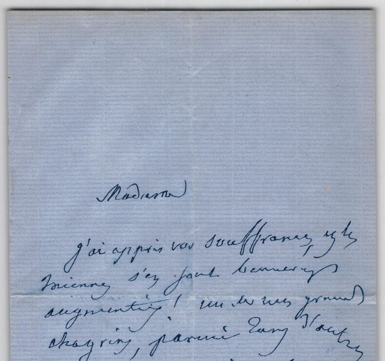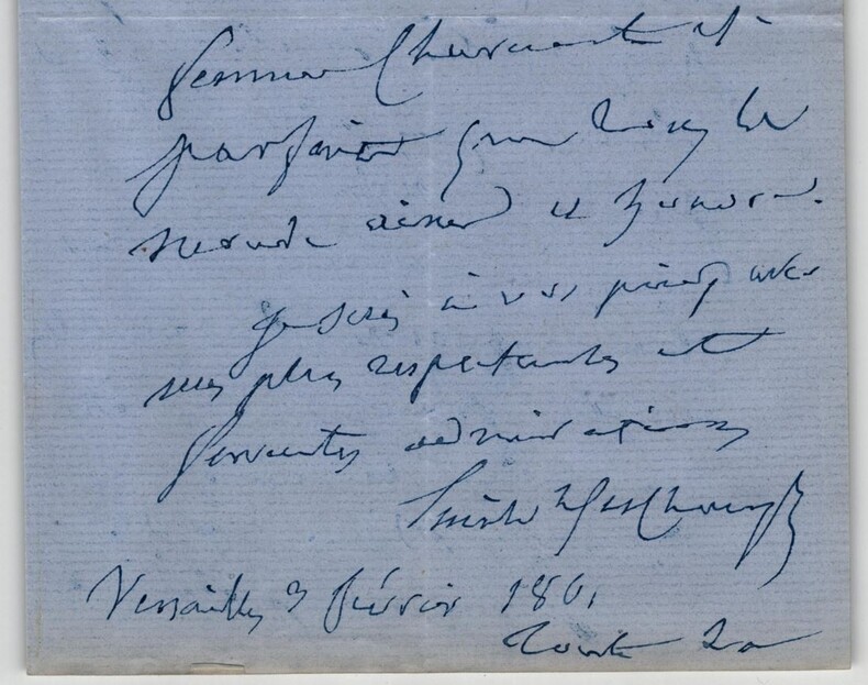Emile Deschamps - Lettre autographe signée, 2 février 1861 à Versailles 4 pages Poète Lettre autographe signée d'Emile Deschamps signée à une correspondante 4 pages in-8 sur papier bleu avec encre bleue. Écrite à une correspondante souffrante, cette lettre témoigne d'ne attention délicate et d'un soutien affectueux. L'auteur, apprenant l'aggravation de son état, exprime son empathie et son regret de ne pouvoir venir lui rendre visite. Il l'encourage avec chaleur, saluant sa force morale, et évoque également un certain Monsieur Vidal. La dernière page évoque la visite d'un abbé et des souvenirs partagés, dans une tonalité résolument bienveillante. Deschamps, poète romantique actif dans les cercles hugoliens et journaliste influent, est ici représenté dans une posture privée, empreinte d'humanité. Dimensions : 20,5 x 13,5 cm État : Voir photos et description pour plus de détails. Nombre de pages : 4 pages Emile Deschamps Émile de Saint-Amand Deschamps était un poète français né à Bourges. Fils d'un fonctionnaire, il adopta la carrière de son père, mais se distingua dès 1812 par une ode, La Paix conquise, qui lui valut les louanges de Napoléon. Wikipédia