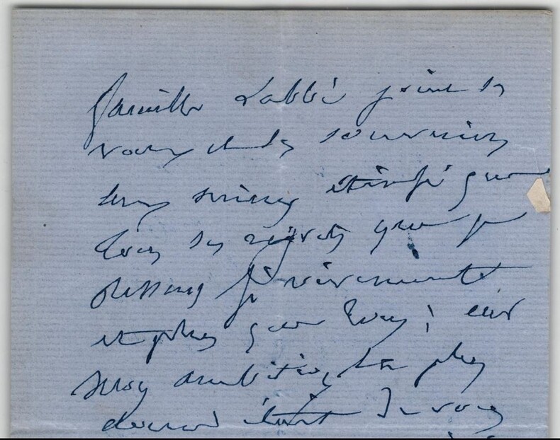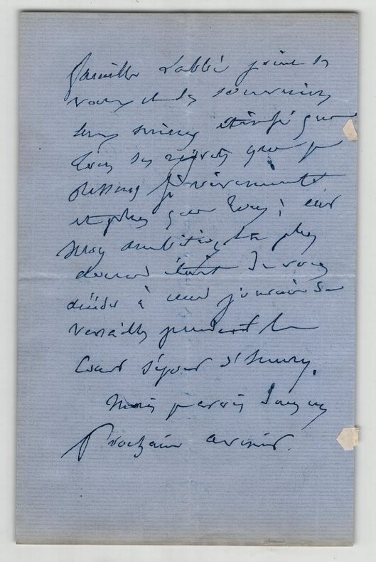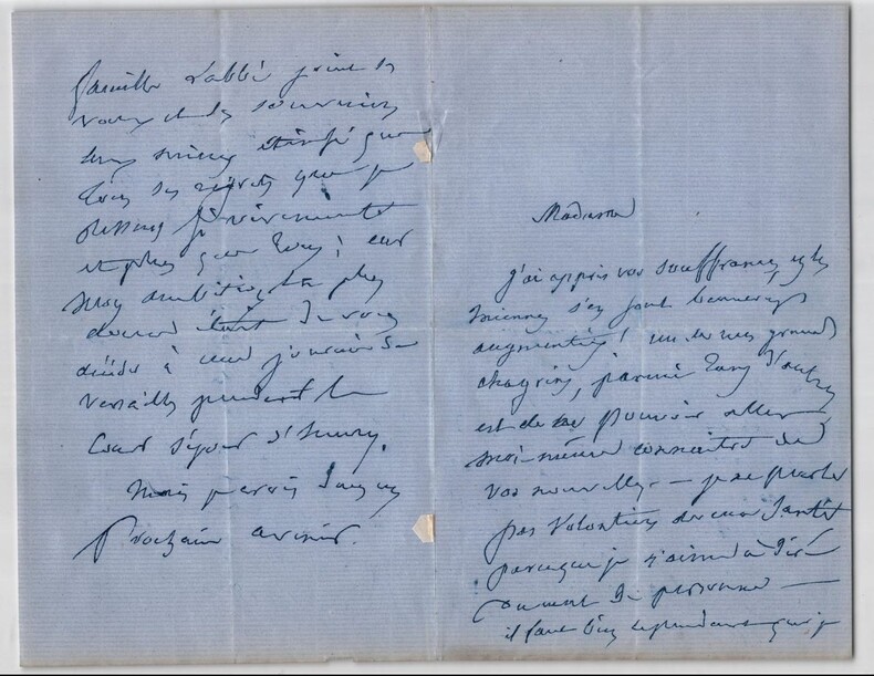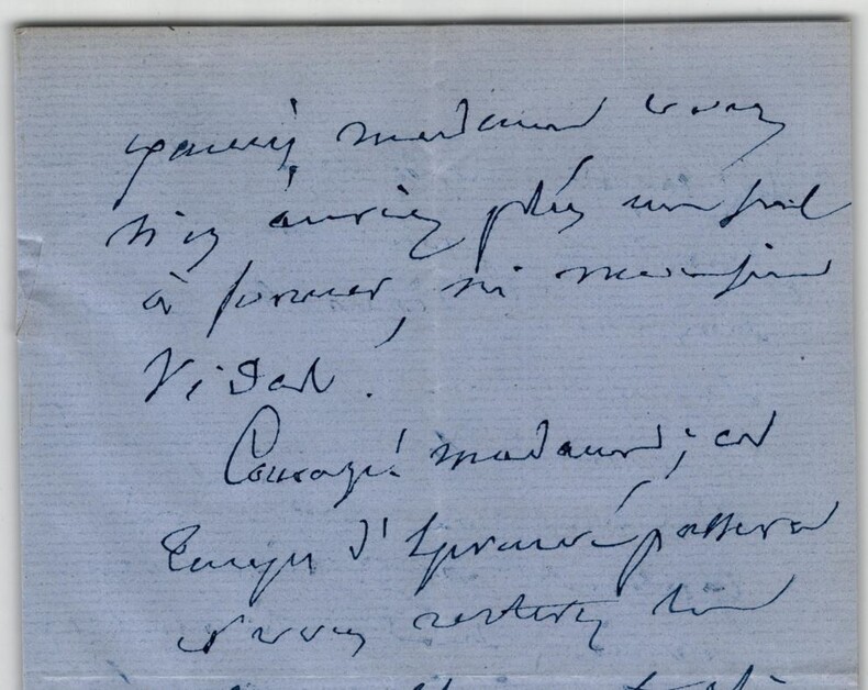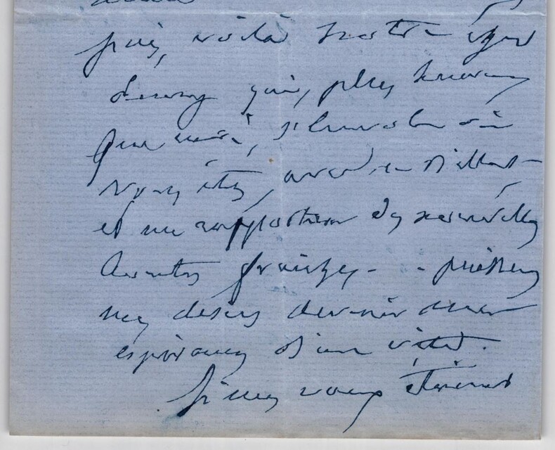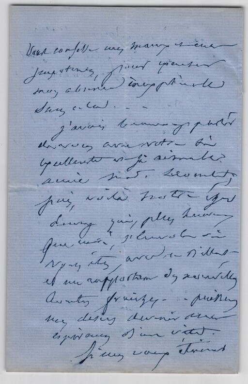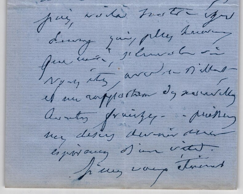 Emile Deschamps - Lettre autographe signée, 2 février 1861 à Versailles 4 pages Poète Lettre autographe signée d'Emile Deschamps signée à une correspondante 4 pages in-8 sur papier bleu avec encre bleue. Écrite à une correspondante souffrante, cette lettre témoigne d'ne attention délicate et d'un soutien affectueux. L'auteur, apprenant l'aggravation de son état, exprime son empathie et son regret de ne pouvoir venir lui rendre visite. Il l'encourage avec chaleur, saluant sa force morale, et évoque également un certain Monsieur Vidal. La dernière page évoque la visite d'un abbé et des souvenirs partagés, dans une tonalité résolument bienveillante. Deschamps, poète romantique actif dans les cercles hugoliens et journaliste influent, est ici représenté dans une posture privée, empreinte d'humanité. Dimensions : 20,5 x 13,5 cm État : Voir photos et description pour plus de détails. Nombre de pages : 4 pages Emile Deschamps Émile de Saint-Amand Deschamps était un poète français né à Bourges. Fils d'un fonctionnaire, il adopta la carrière de son père, mais se distingua dès 1812 par une ode, La Paix conquise, qui lui valut les louanges de Napoléon. Wikipédia
