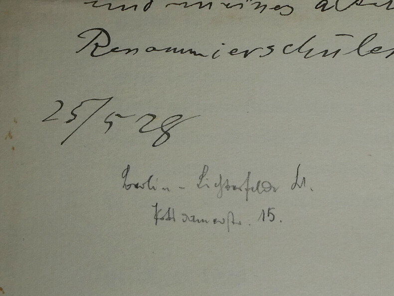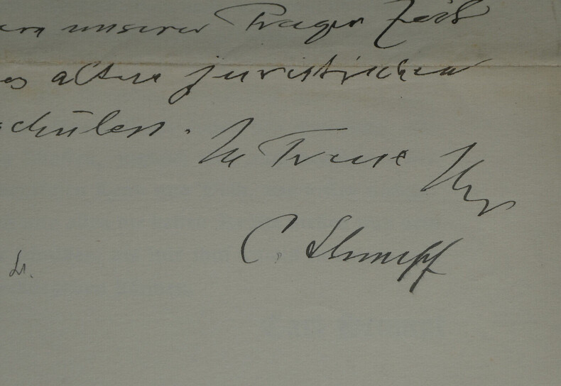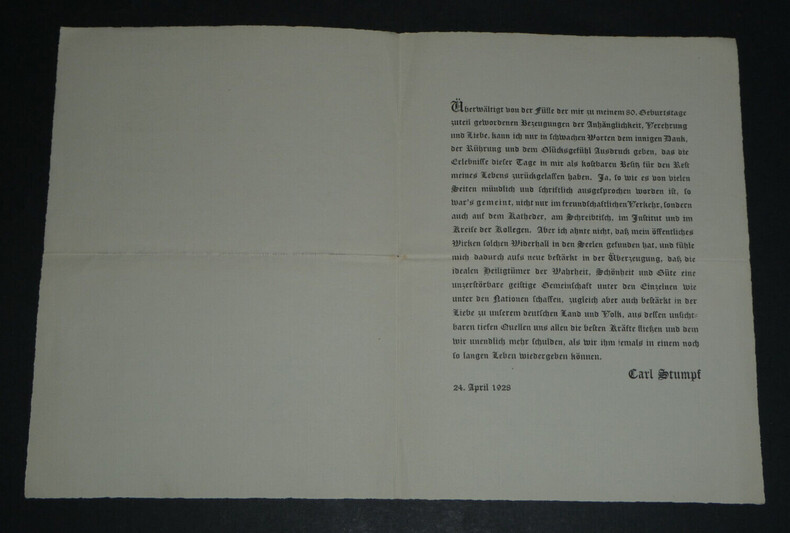 Carl STUMPF. Lettre autographe signée de remerciements et de v ux en date du 25 mai 1928 P hilosophe et psychologue Lettre autographe signée de remerciement et de v ux en allemand datée du 25 mai 1928. Et également une lettre générique de remerciements dactylographiée datant du 24 avril 1928. Lettre autographe : "Cher collègue, Veuillez accepter ce message de remerciement, envoyé tardivement par erreur, pour votre aimable souvenir et en même temps les v ux sincères pour votre santé ! Je pense beaucoup et avec plaisir à notre époque pragoise et à mon ancien élève de renom en droit. Fidèlement à vous 25/5 28" Lettre dactylographiée: "Submergé par l'abondance des témoignages d'attachement, de dévotion et d'amour qui m'ont été adressés à l'occasion de mon 80e anniversaire, je ne peux exprimer qu'avec des mots faibles les remerciements intimes, l'émotion et le sentiment de bonheur que les expériences vécues ces jours-ci ont laissé en moi comme un ciment solide pour la suite de ma vie. Oui, comme cela a été exprimé de toutes parts, oralement et par écrit, c'est ce que j'ai voulu dire, non seulement dans les relations amicales, mais aussi au conseil, au bureau, à l'institut et dans le cercle des collègues. Mais je ne me doutais pas que mon action publique avait trouvé un tel écho dans les âmes, et je me sens ainsi à nouveau renforcé dans la conviction que les sanctuaires idéaux de la vérité, de la beauté et de la douceur créent une communauté spirituelle indestructible entre les individus et les nations, mais en même temps, nous sommes confortés dans notre amour pour notre pays et notre peuple allemands, dont les sources profondes et invisibles nous fournissent à tous les forces nécessaires et auxquels nous devons infiniment plus que ce que nous pourrons lui rendre au cours d'une vie encore longue. 24 avril 1928" Dimensions : 23,2 x 17 cm État : Voir photos pour plus de détails. Nombre de pages : 2 pages Carl STUMPF Carl Stumpf est un psychologue et philosophe allemand. Connu de ses contemporains pour ses travaux sur la perception notamment auditive et pour sa théorie des émotions, il a exercé une influence majeure sur la phénoménologie de Husserl et sur la psychologie de la forme. Wikipédia