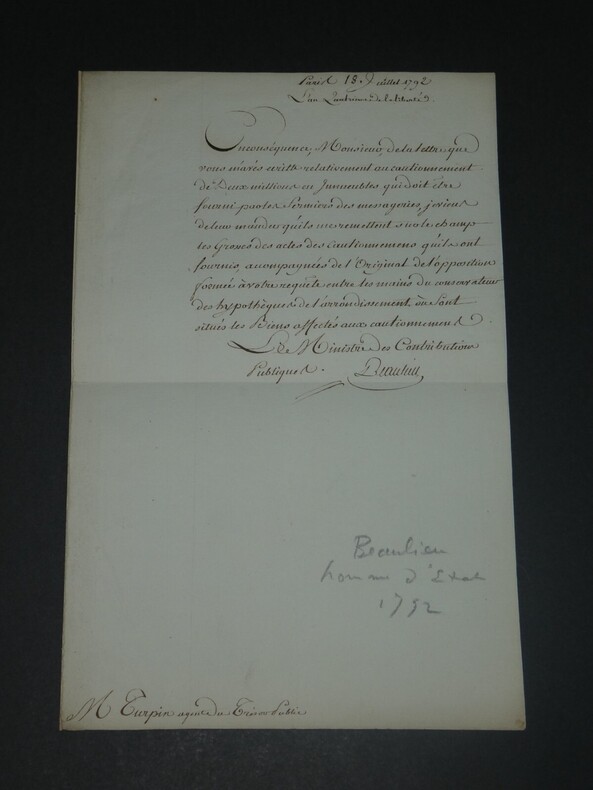 Jules-Emile-François-Hervé de Beaulieu. Lettre signée à Monsieur Turpin, Agent du Trésor Public- 1792 Homme politique Lettre signée par Jules-Émile-François Hervé de Beaulieu, Ministre des Contributions Publiques, adressée à Monsieur Turpin, Agent du Trésor Public, datée du 18 juillet 1792 à Paris. Au sujet du cautionnement de deux millions en Immeubles qui doit être fourni par des fermiers. Dimensions : 20.4 x 31.5 cm État : Voir photos pour plus de détails. Nombre de pages : 1 pages Jules-Émile-François Hervé de Beaulieu Jules-Émile-François Hervé de Beaulieu est un avocat, financier et homme politique français. Wikipédia Lettres autographes, vieux papiers, livres anciens, photographies, gravures, timbres... Nous expertisons et/ou rachetons dans toute la France vos lettres, collections de lettres et livres anciens.