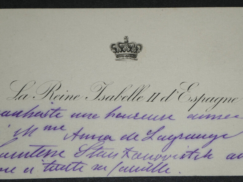 Isabelle II d'Espagne. Carte de visite autographe de v ux adressée à Mme Anna de La grange de Stankowitch Reine Carte de visite autographe adressée à Mme Anna de Lagrange de Stankowitch pour lui souhaiter ses bons voeux. "La Reine Isabelle II d'Espagne. Souhaite une heureuse année à Mme Anna de Lagrange Comtesse Stankowitch ainsi que à toute sa famille." Dimensions : 6,3 x 10,6 cm État : Voir photos pour plus de détails. Nombre de pages : 1 page