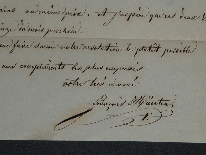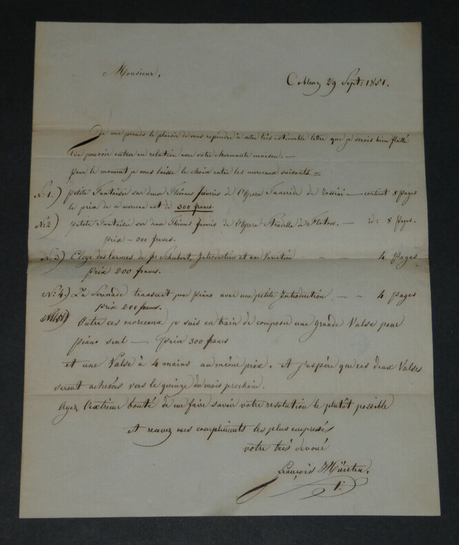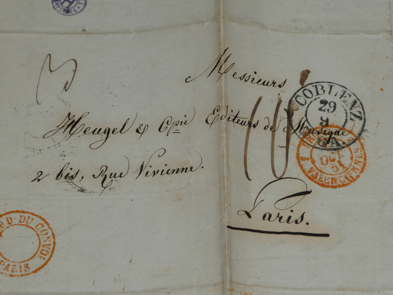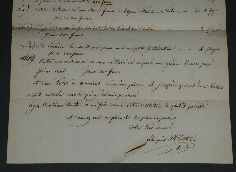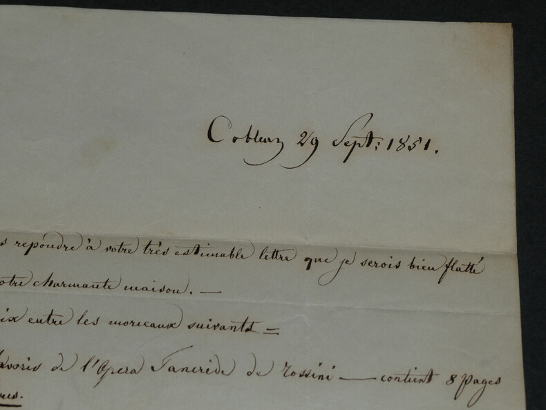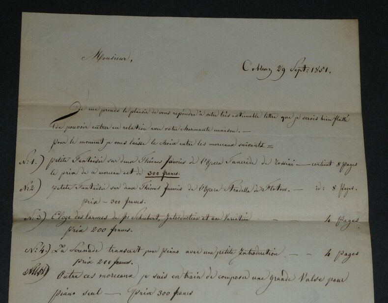 Franz HÜNTEN - LETTRE AUTOGRAPHE SIGNÉE, 1851 Compositeur et pianiste prussien Lettre autographe signée aux éditions Heugel datée du 31 octobre 1851, il envoie sa valse terminée, il espère que Monsieur Heugel en sera satisfait. Il demande la plus grande exactitude au graveur, la confirmation de la réception de son courrier, et que la correction de ses épreuves soit faite par un artiste ayant l'habitude de cela. Dimensions : 20,8 x 27,1 cm État : Restauration d'une grande déchirure au bas de la lettre. Voir photos pour plus de détails. Nombre de pages : 1 page Franz HÜNTEN Franz Hünten, est un pianiste et compositeur prussien. Wikipédia