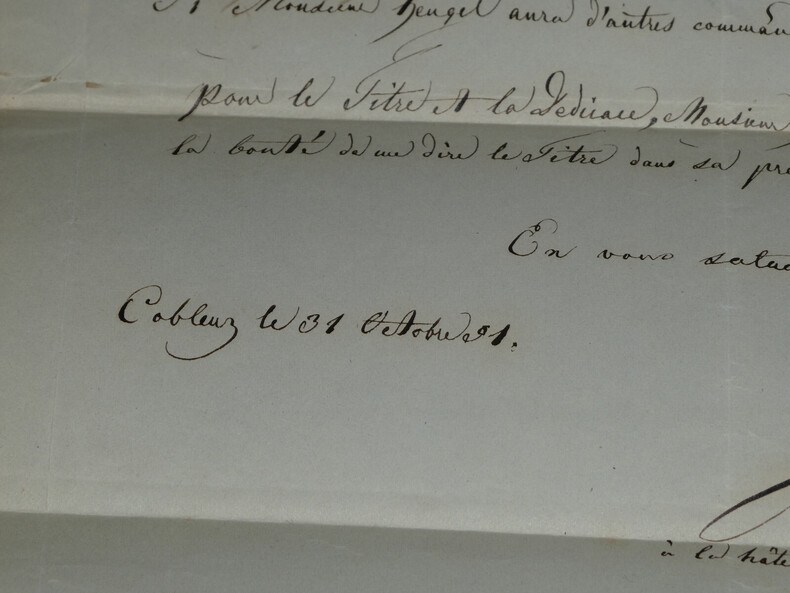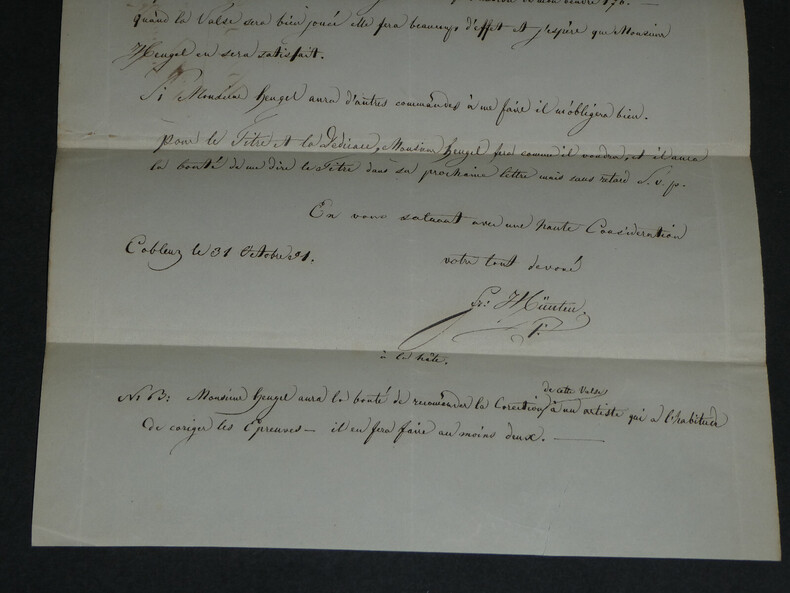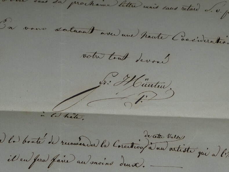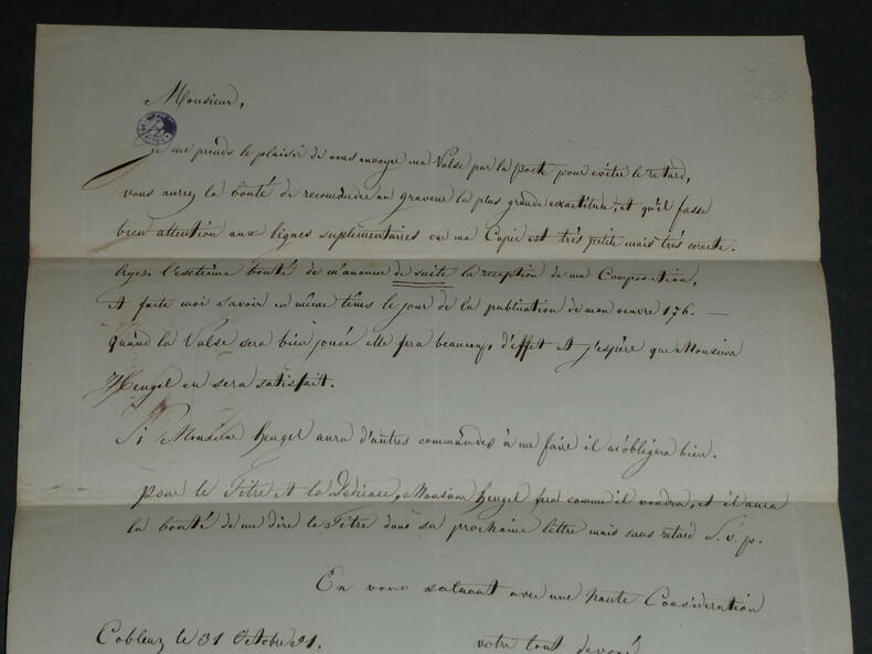 Franz HÜNTEN - LETTRE AUTOGRAPHE SIGNÉE, 1851 Compositeur et pianiste prussien Lettre autographe signée aux éditions Heugel datée du 31 octobre 1851, il envoie sa valse terminée, il espère que Monsieur Heugel en sera satisfait. Il demande la plus grande exactitude au graveur, la confirmation de la réception de son courrier, et que la correction de ses épreuves soit faite par un artiste ayant l'habitude de cela. Dimensions : 20,8 x 27,1 cm État : Restauration d'une grande déchirure au bas de la lettre. Voir photos pour plus de détails. Nombre de pages : 1 page Franz HÜNTEN Franz Hünten, est un pianiste et compositeur prussien. Wikipédia