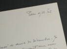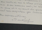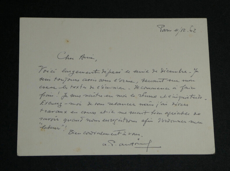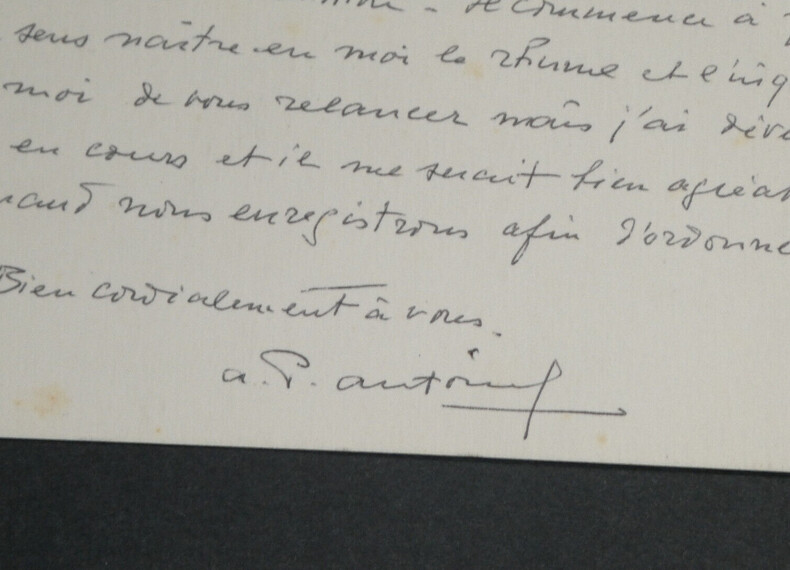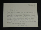 André-Paul ANTOINE. Carte lettre autographe signée - 1962 Réalisateur Carte lettre autographe signée d'André-Paul ANTOINE, datée du 11 décembre 1962, adressée à un ami. "Cher ami, Voici largement dépassé le seuil de décembre. Je suis toujours assis sous l'orme, serrant sur mon c ur les textes de l'émission. Je commence à faire frais ! Je sens naître en moi le rhume et l'inquiétude. Excusez-moi de vous relancer mais j'ai divers travaux en cours et il me serait bien agréable de savoir quand nous enregistrons afin d'ordonner mon "labeur" ! Bien cordialement à vous." Dimensions : 13,8 x 10,3 cm État : Voir photos pour plus de détails. Nombre de pages : 1 page André-Paul ANTOINE André-Paul Antoine est un réalisateur, scénariste et dialoguiste français né le 17 août 1892 dans le 18 arrondissement de Paris et mort le 10 octobre 1982 dans ce même arrondissement, d'un arrêt cardiaque dans son sommeil. Wikipédia
