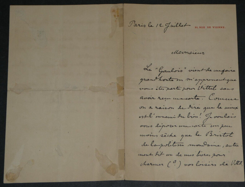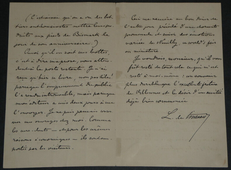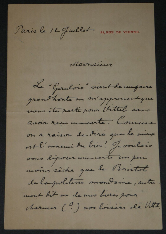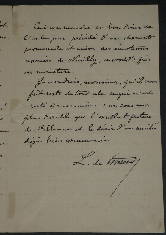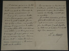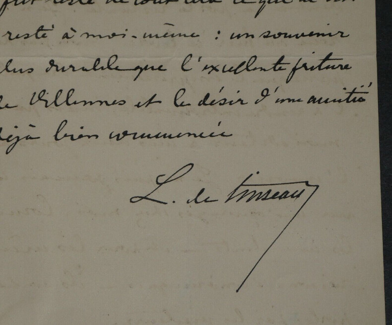 Léon de TINSEAU - LETTRE AUTOGRAPHE SIGNÉE "un souvenir plus durable" Écrivain Léon de TINSEAU - LETTRE AUTOGRAPHE SIGNÉE "un souvenir plus durable". Lettre adressée pour l'envoi d'un livre, le correspondant se trouve à Vittel, et l'auteur se remémore "un souvenir plus durable que l'excellente friture de [Villennes] et le désir d'une amitié déjà bien commencée". Dimensions : 17,7 x 11,3 cm État : Voir photos pour plus de détails. Nombre de pages : 3 page Léon de TINSEAU Antoine Joseph Léon de Tinseau, né à Autun en Saône-et-Loire le 20 avril 1842 et mort le 24 décembre 1921 à Paris 8 , est un écrivain français du XIX siècle. Wikipédia