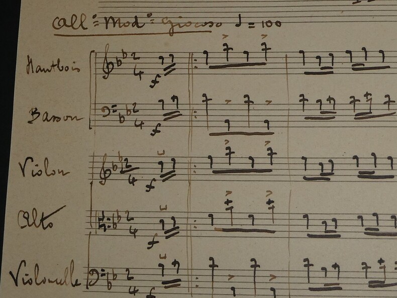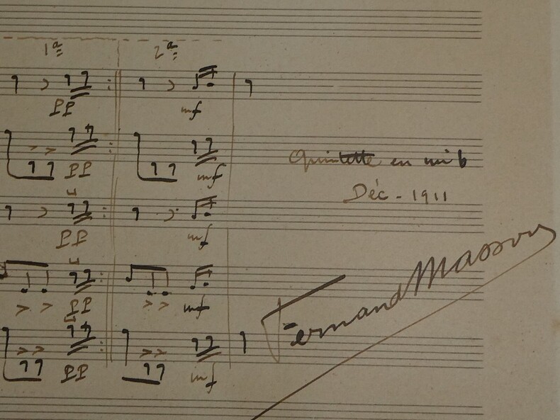 Partition manuscrite musicale intitulée "Rigaudon" de Fernand Masson, 1911. Partition entièrement rédigée à la main par Masson "dans le style de Rameau". Etat : Voir photos pour plus de détails. Dimensions : 25,6 x 21,2 cm. 1 page.