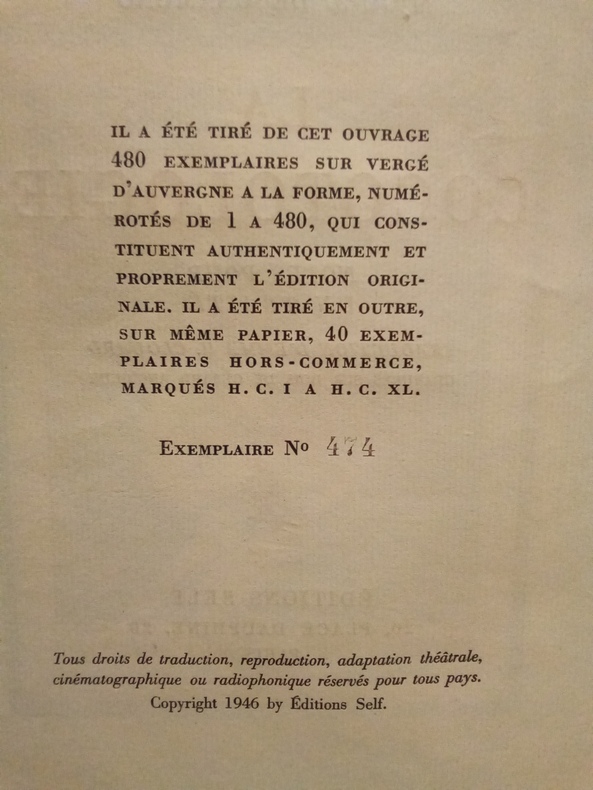 Tirage à 480 exemplaires sur Vergé d'Auvergne à la forme et 40 exemplaires Hors-Commerce, celui-ci n°474, constituant authentiquement et proprement l'édition originale. Bon état.