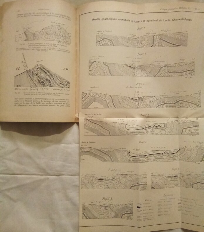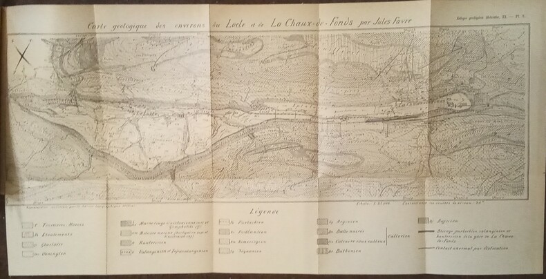 Thèse présentée à la Faculté des Sciences de l'université de Genève pour l'Obtention du Grade de Docteur ès Science Naturelles par Jules Favre, de Neuchâtel (Suisse). Thèse N°461. Ouvrage orné de figures de coupes et des planches 4 et 5 dépliantes de Profils géologiques successifs à travers le synclinal du Locle-Chaux-de-Fonds et Carte géologique des environs du Locle et de La Chaux-de-Fond, par Jules Favre. Lausanne, Imprimerie Réunies S.A., 1911. In-8 (22x15,5cm) cartonnage éditeur imprimé. Pagination de 369 à 476. Exemplaire avec cachets de bibliothèque.