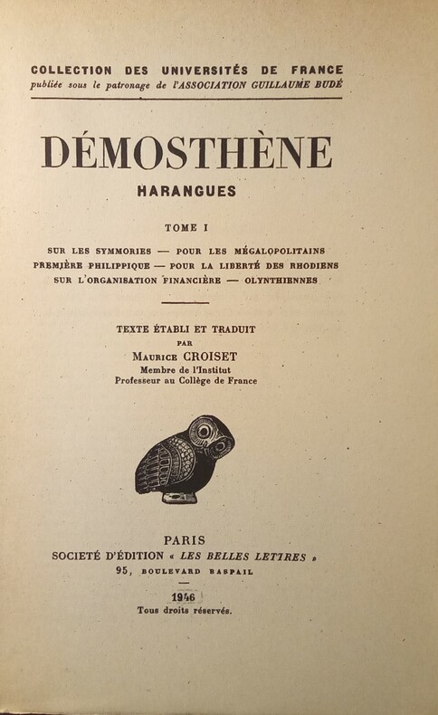 Tome I:Harangues :Sur les Symmories – Pour les Mégalopolitains – Premières Philippique – Pour la Liberté des Rhodiens – Sur L'Organisation Financières – Olynthiennes. Texte établi et traduit par Maurice Croiset. Paris, Société d'Édition Les Belles Lettres. Collection des Universités de France, publiée sous le patronage de l'Association Guillaume Budé,1946. In-8 (20x13,3cm) broché de couverture orange avec le logo de la collection. XLVIII,137pp.