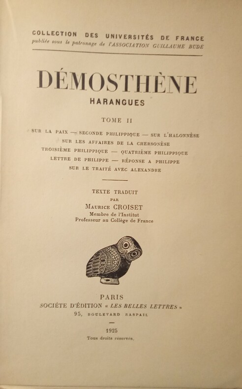 Tome II: Harangues :Sur la Paix – Seconde Philippique – Sur L'Halonnèse – Sur les Affaires de la Chersonèse – Troisième Philippique – Quatrième Philippique – Lettre de Philippe – Réponse à Philippe – Sur le Traité avec Alexandre. Texte traduit par Maurice Croiset. Paris, Société d'Édition «Les Belles Lettres». Collection des Universités de France, publiée sous le patronage de l'Association Guillaume Budé, 1925. In-8 (20x13,3cm) broché de couverture orange avec le logo de la collection. 183pp.