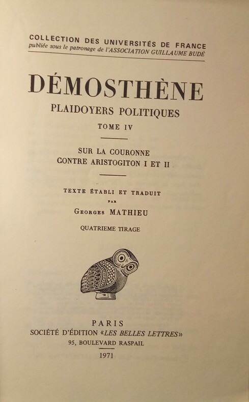 Tome IV: Plaideurs Politiques – Sur la Couronne – Contre Aristogiton I et II. Texte établi et traduit par Georges Mathieu. 4ème édition. Paris, Société d'Édition «Les Belles Lettres». Collection des Universités de France, publiée sous le patronage de l'Association Guillaume Budé, 1971. In-8 (20x13,3cm) broché de couverture orange avec le logo de la collection. 213pp.